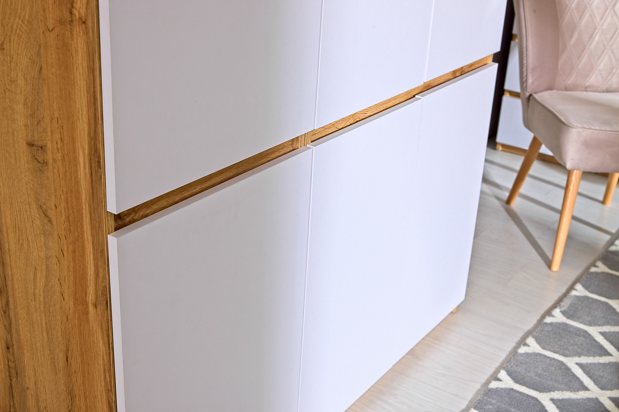 V hornej časti skrine sa nachádza šatníková tyč na zavesenie oblečenia. V spodnej časti skrinky sa nachádza polička.