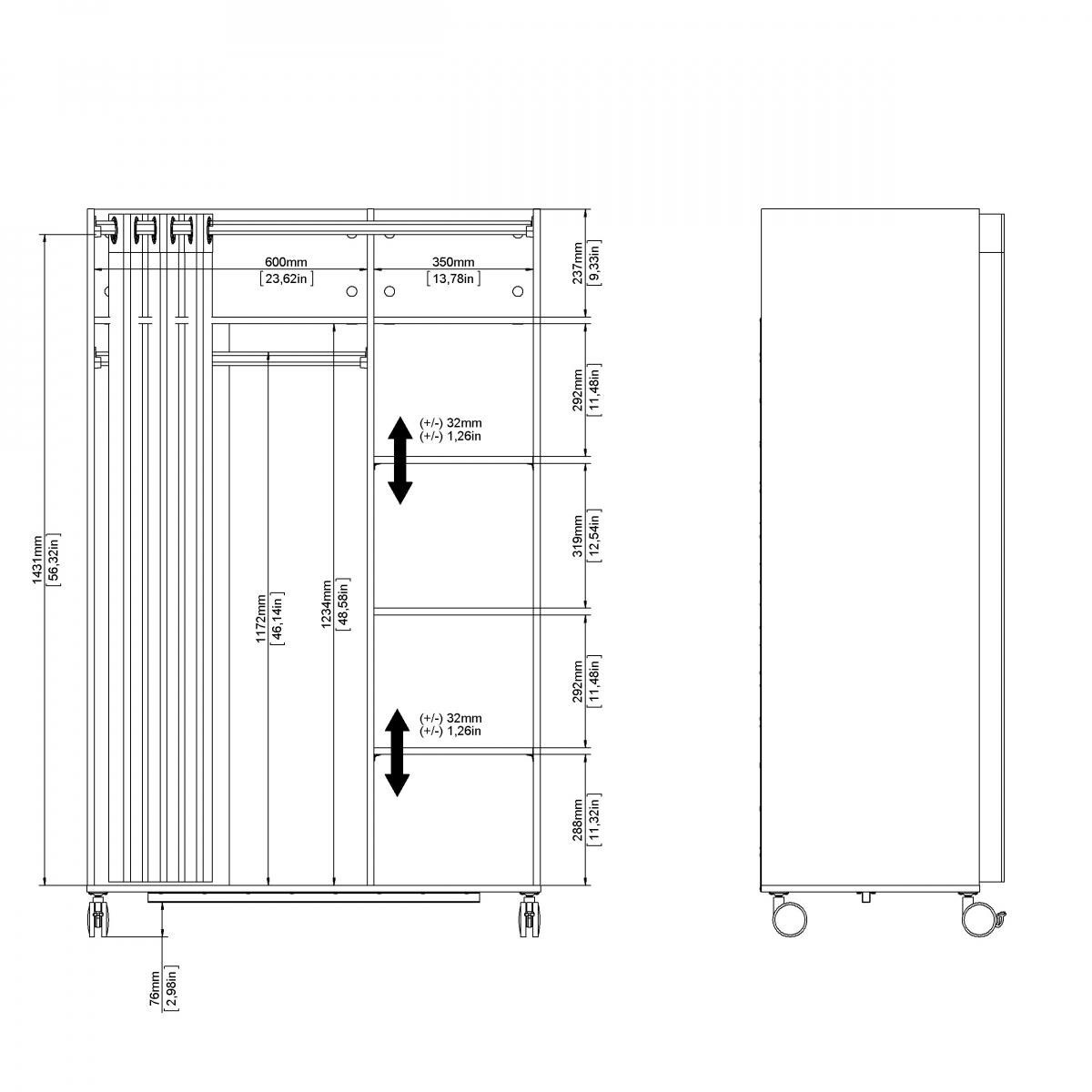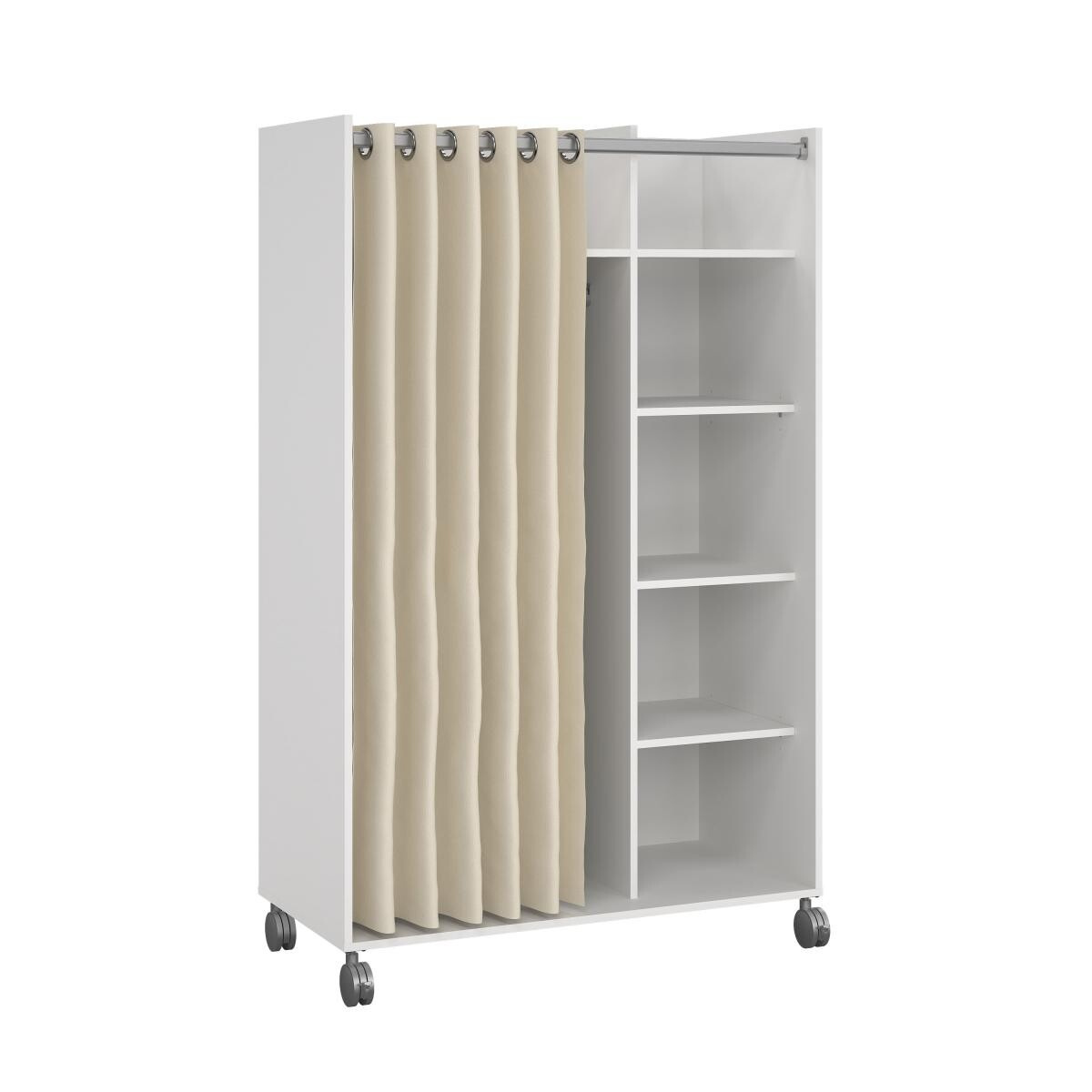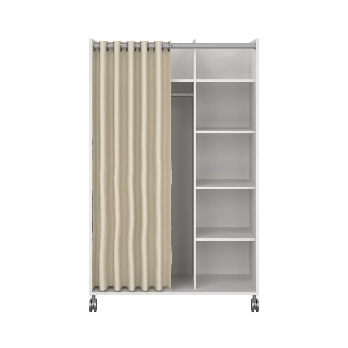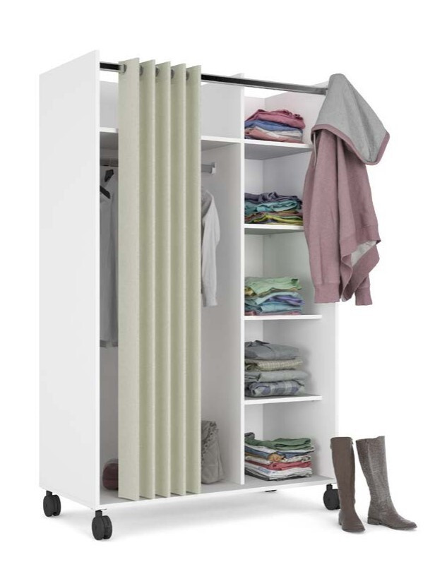 Mobilná šatníková skriňa Harmony na kolieskach má neobvyklý a originálny dizajn. Skriňa má dostatok úložného priestoru a všestranné využitie. Je vyrobená z laminátu a klasické dvierka sú nahradené pántom krémovej farby. Vďaka kolieskam môžete skrinku ľahko premiestniť, kam potrebujete. Skvele sa hodí do študentských izieb, kancelárií, detských izieb alebo chodieb. Skriňa sa dodáva v demontovanom stave. Balenie obsahuje montážny plán vrátane všetkých spojovacích prvkov. Zobrazené príslušenstvo a dekorácie nie sú súčasťou balenia.