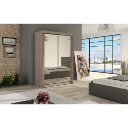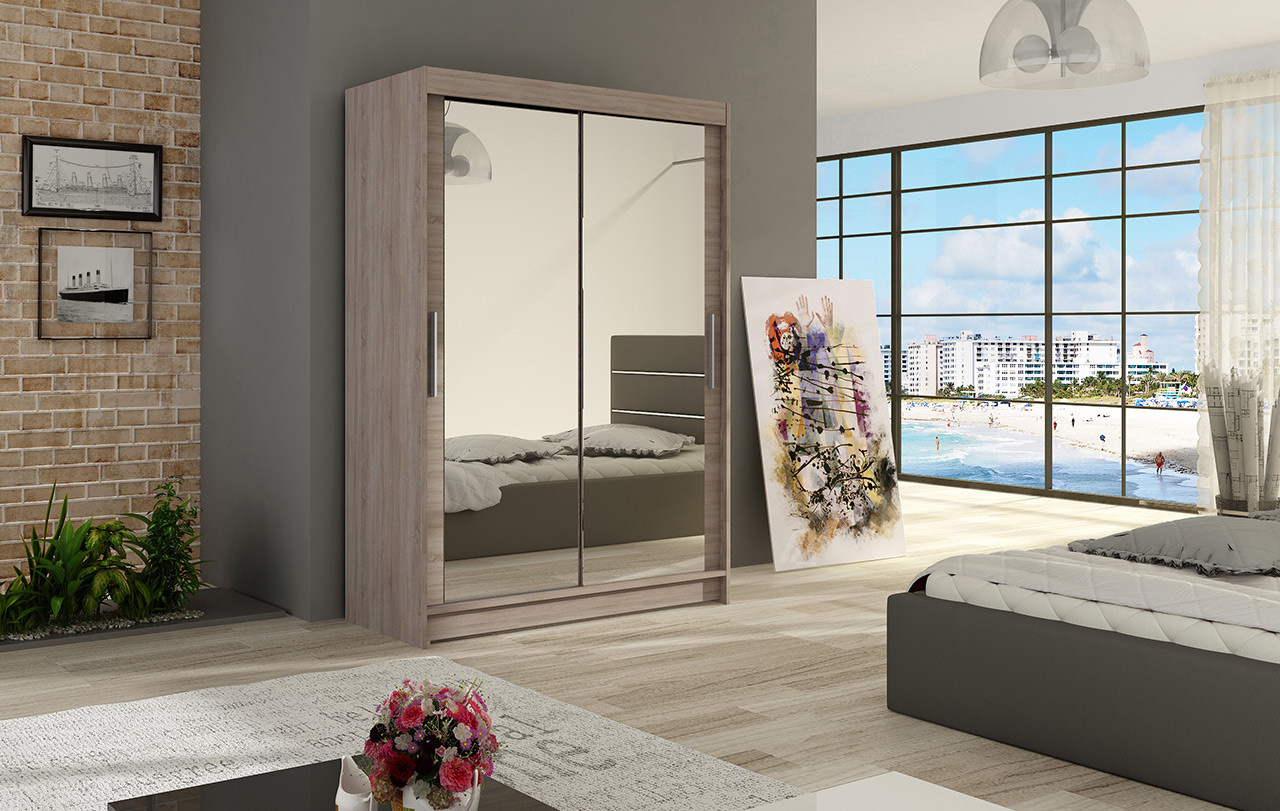 Moderný a elegantný dizajn skrine osloví aj náročných zákazníkov. Eleganciu podčiarkujú dlhé strieborné úchyty a zrkadlá na dverách skrine. Je vyrobená z lamina o hrúbke 16 mm a hrany sú ukončené ABS lištou. Vodiace lišty sú vyrobené z odolného hliníka a spĺňajú požiadavky na každodenné používanie. Vďaka svojmu usporiadaniu poskytuje dostatok úložného priestoru. Skvele sa hodí do spálne, predsiene, detskej alebo študentskej izby. Skriňa je dodávaná v demonte a súčasťou je montážny plánik vrátane všetkých potrebných spojovacích materiálov. Zobrazené dekorácie nie sú v cene. Súčasťou sú aj sklenené zrkadlá, ktoré sú nalepené na dverách skrine.