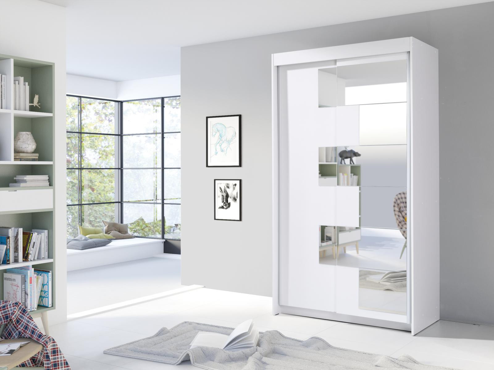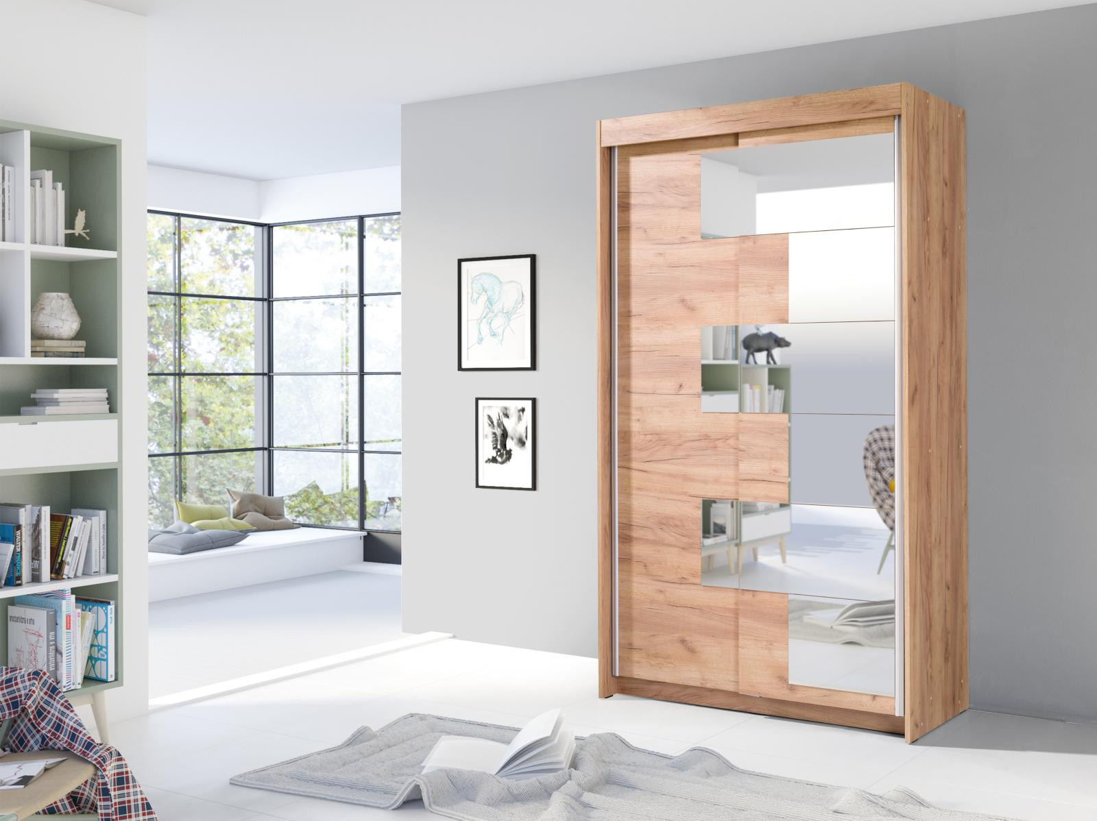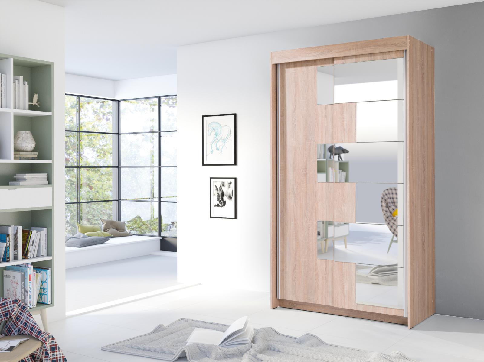 Šatníková skriňa s posuvnými dverami Szarlota, je vyrobená z kvalitného lamina. Vďaka svojmu vnútornému usporiadaniu ponúka dostatok úložného priestoru, posuvné dvere šetria priestor a zrkadlo s netradičným osadením ho opticky zväčšuje. Skriňa je vhodná do spálne, detskej alebo študentskej izby, do predsiene aj kancelárie. Vnútorné usporiadanie skrine je zobrazené na fotografii. Skriňa je dodávaná v demonte a súčasťou je montážny plánik vrátane všetkých potrebných spojovacích materiálov. Zobrazené dekorácie nie sú v cene. Skriňu ponúkame v dekore biela, dub sonoma a dub zlatý.