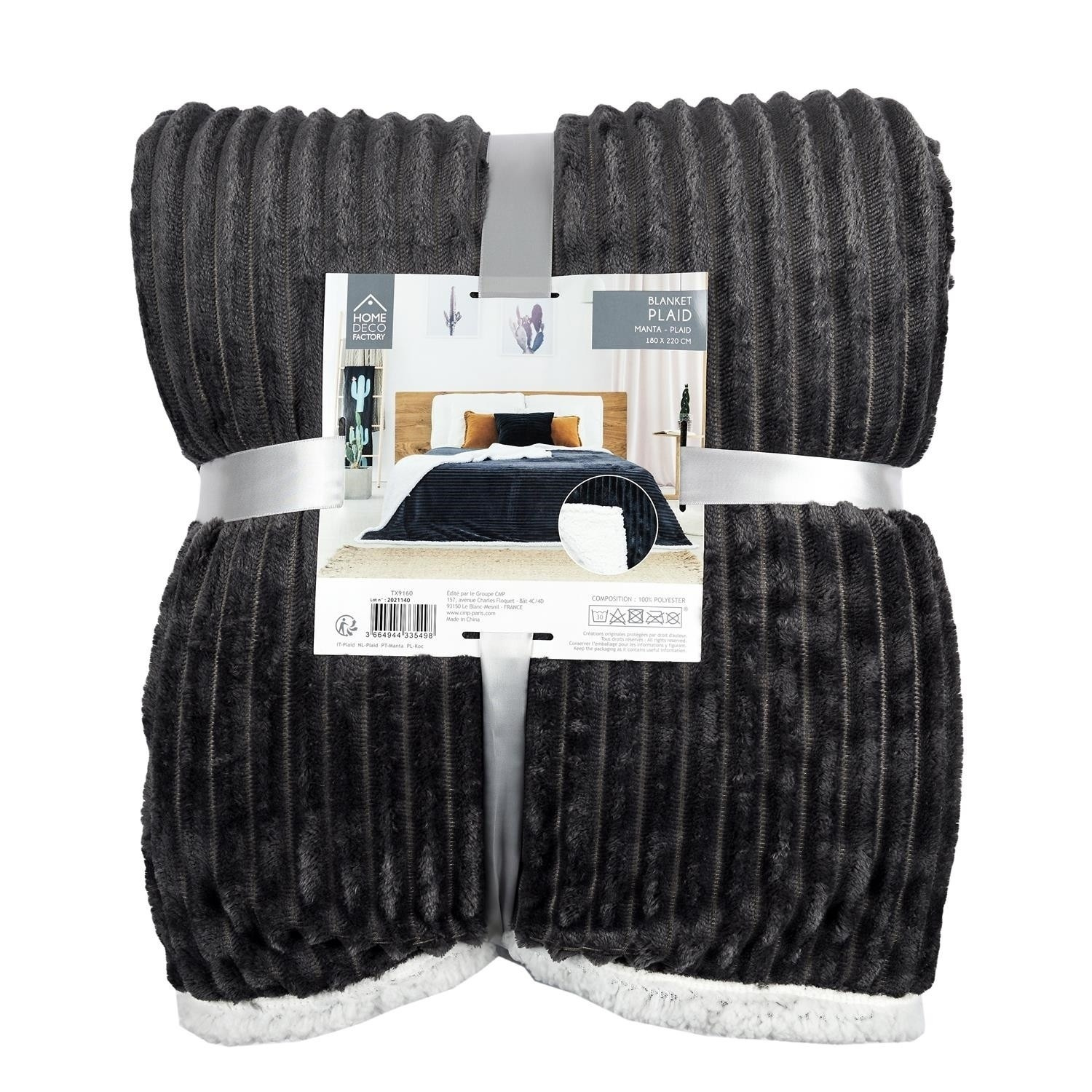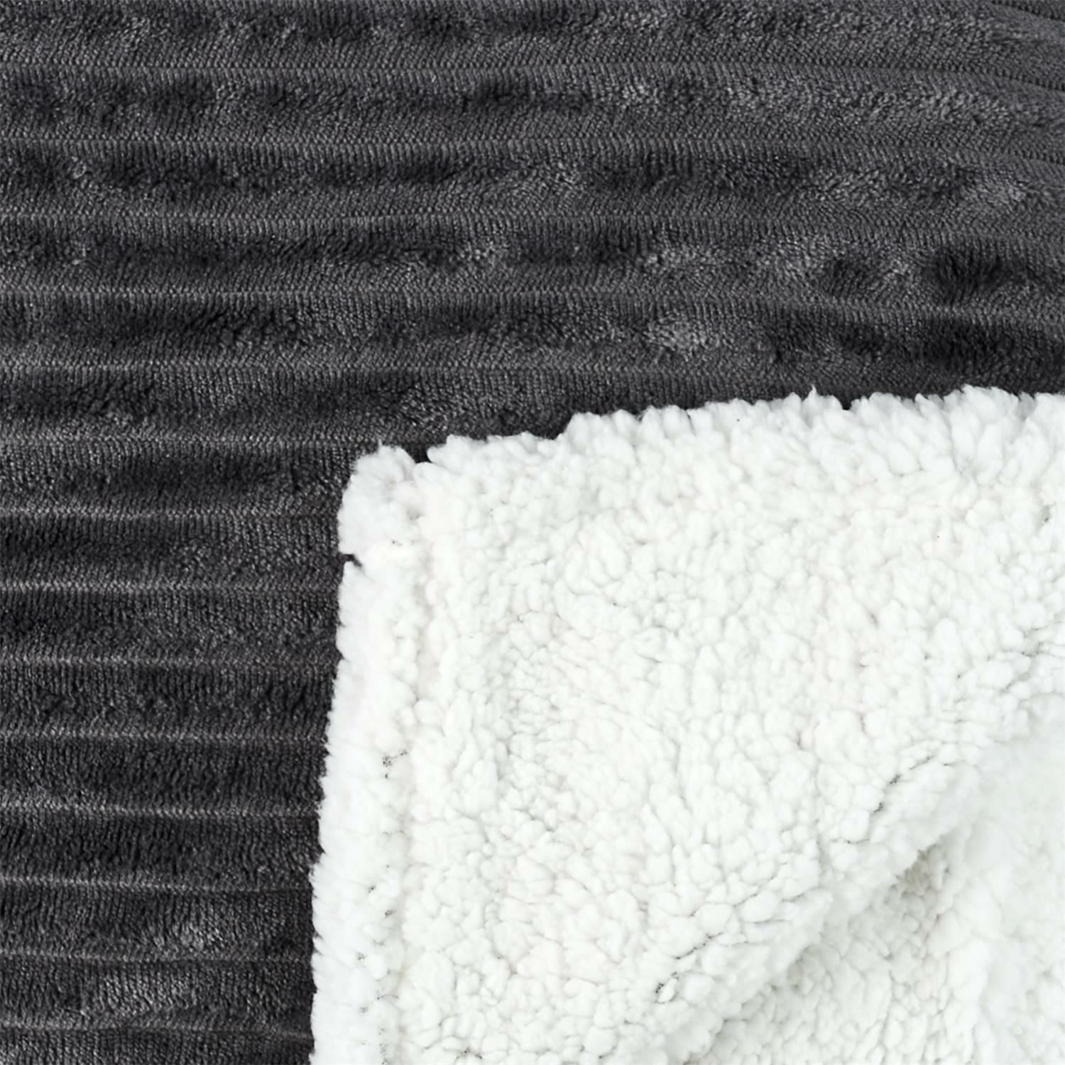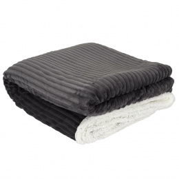 Veľmi hrubá deka Sherpa z šedej rebrovanej tkaniny je z druhej strany obšitá bielou mäkkou plyšovou tkaninou. Použitie silných a teplých materiálov spôsobuje, že deka je veľmi silná až 6 cm, čo poskytuje veľa tepla a mäkkosti. Prehoz sa osvedčí ako prikrývka počas chladného večera, ale môže tiež slúžiť ako ochrana podlahy pre hrajúce sa deti.