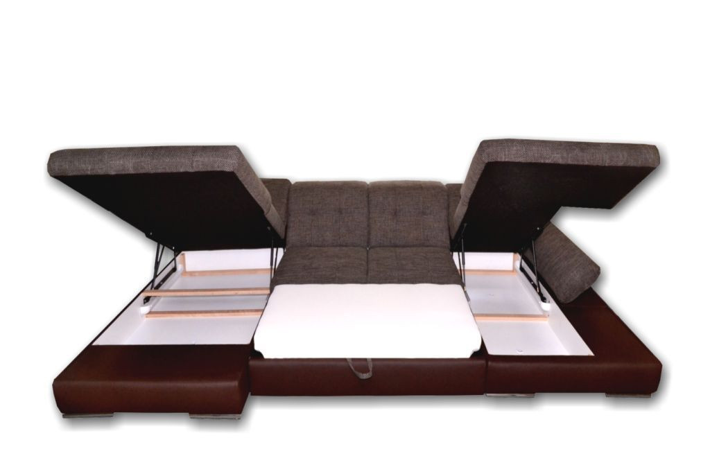Pohodlná sedacia súprava 180x365x200 cm s nastaviteľnými podrúčkami a piatimi nastaviteľnými opierkami hlavy. V oboch prístavbách sú veľké úložné priestory vybavené plynovými piestami na jednoduché ovládanie. Pohovka je veľmi pohodlná a ak hľadáte pohovku na leňošenie, je pre vás dobrou voľbou. Jednoduchým rozložením súpravy získate pohodlnú posteľ 280x135 cm vhodnú na príležitostné spanie. Pohovku je možné objednať v pravom alebo ľavom prevedení (pravé prevedenie je zobrazené na úvodnom obrázku).