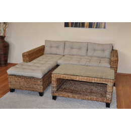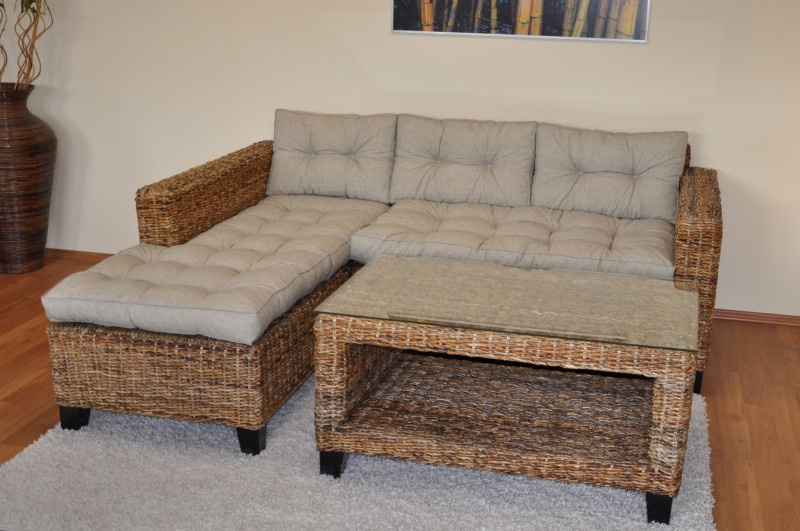 Ratanový nábytok - sedacia súprava Penang s mahagónovým rámom a výpletom z banánových listov. | Konštrukcia sedacej súpravy je vyrobená z masívneho mahagónového dreva, výplň je z banánového listu v prírodnej farbe. Rozmery pohovky sú 203x180x80 cm. Nosnosť pohovky je 300 kg Stôl so sklenenou doskou má rozmery 102x62x51 cm, Súpravu vám dodáme zdarma