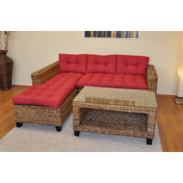 Ratanový nábytok - sedacia súprava Penang s mahagónovým rámom a výpletom z banánových listov. | Konštrukcia sedacej súpravy je vyrobená z masívneho mahagónového dreva, výplň je z banánového listu v prírodnej farbe. Rozmery pohovky sú 203x180x80 cm. Nosnosť pohovky je 300 kg Stôl so sklenenou doskou má rozmery 102x62x51 cm, Súpravu vám dodáme zdarma