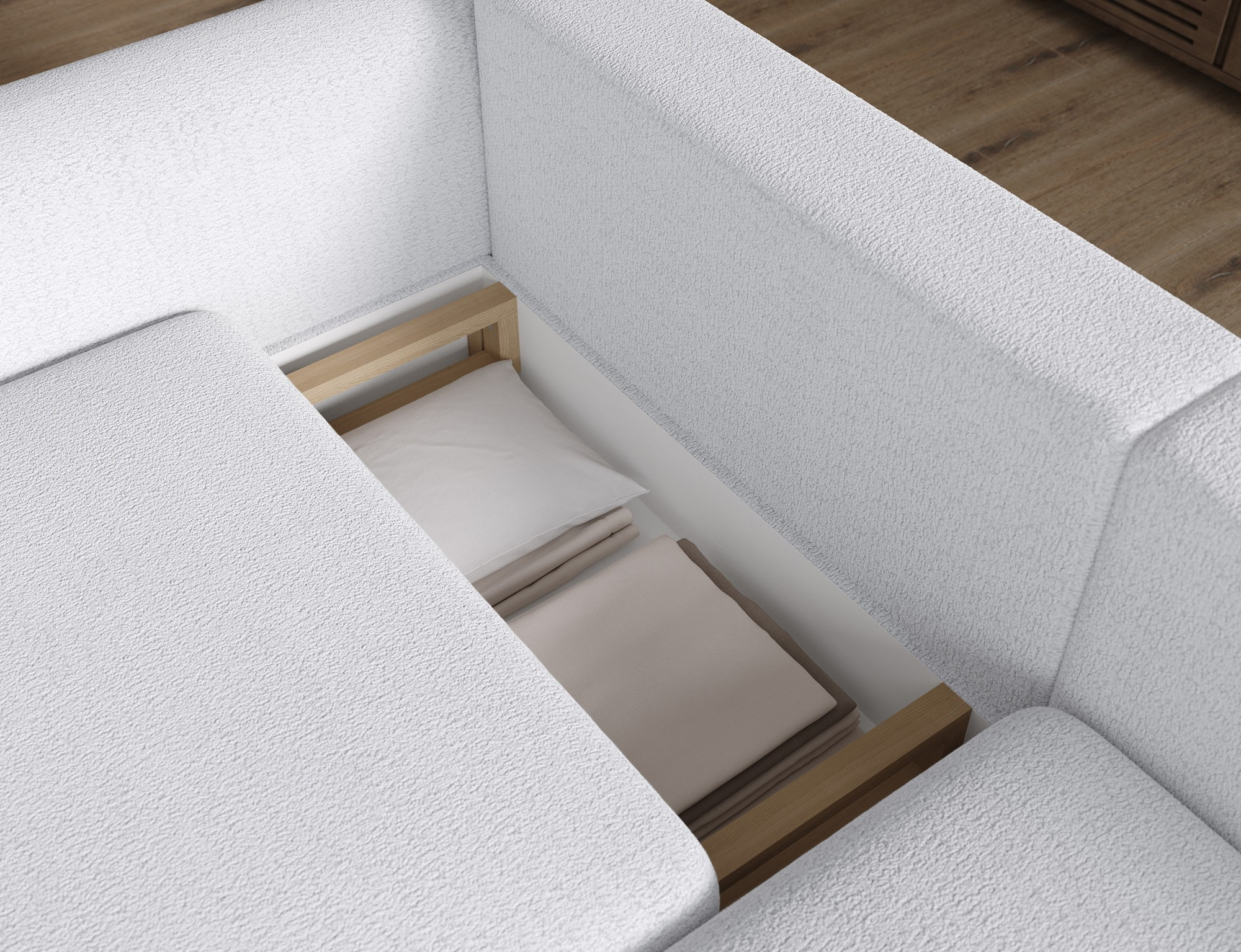 - Úložný priestor: Sedacia súprava je vybavená praktickým úložným priestorom, ktorý vám umožní ľahko uschovať deky, vankúše alebo iné predmety, ktoré chcete mať po ruke, ale zároveň ich mať úhľadne upratané.