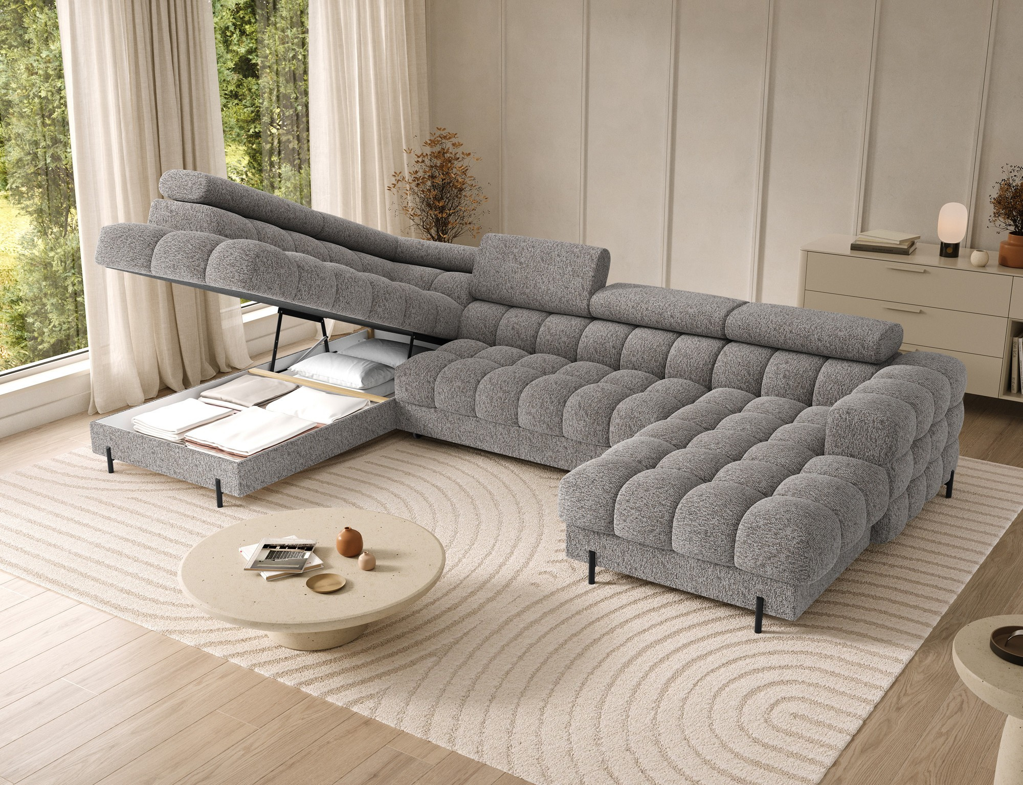 Jednou z hlavných predností tejto sedacej súpravy je jej úložný priestor. Už nikdy nebudete musieť riešiť, kam uložiť deky, vankúše alebo sezónne dekorácie. Všetky tieto veci môžete ľahko a rýchlo uschovať priamo v sedacej súprave, čo vám pomôže udržať vašu obývačku čistú a usporiadanú.