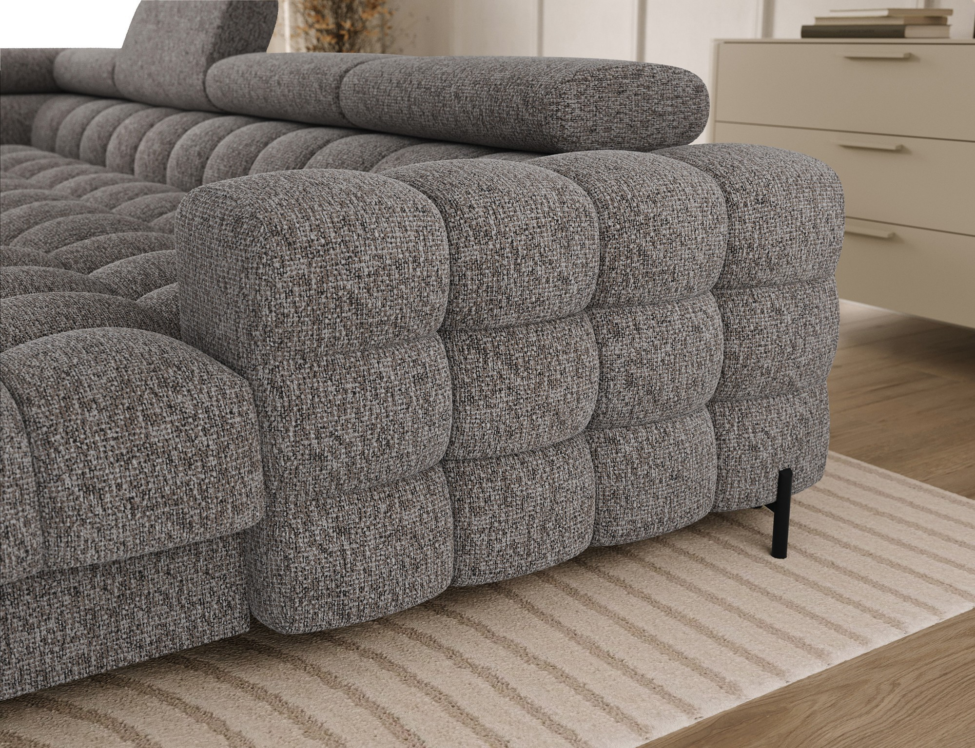 Rohová sedacia súprava Feraria je navrhnutá tak, aby sa prispôsobila akémukoľvek interiéru. Jej univerzálny dizajn a neutrálne farebné prevedenie umožňujú jednoduchú kombináciu s ostatným nábytkom a dekoráciami. Bez ohľadu na to, či preferujete moderný alebo klasický štýl, Feraria sa stane harmonickou súčasťou vášho domova.