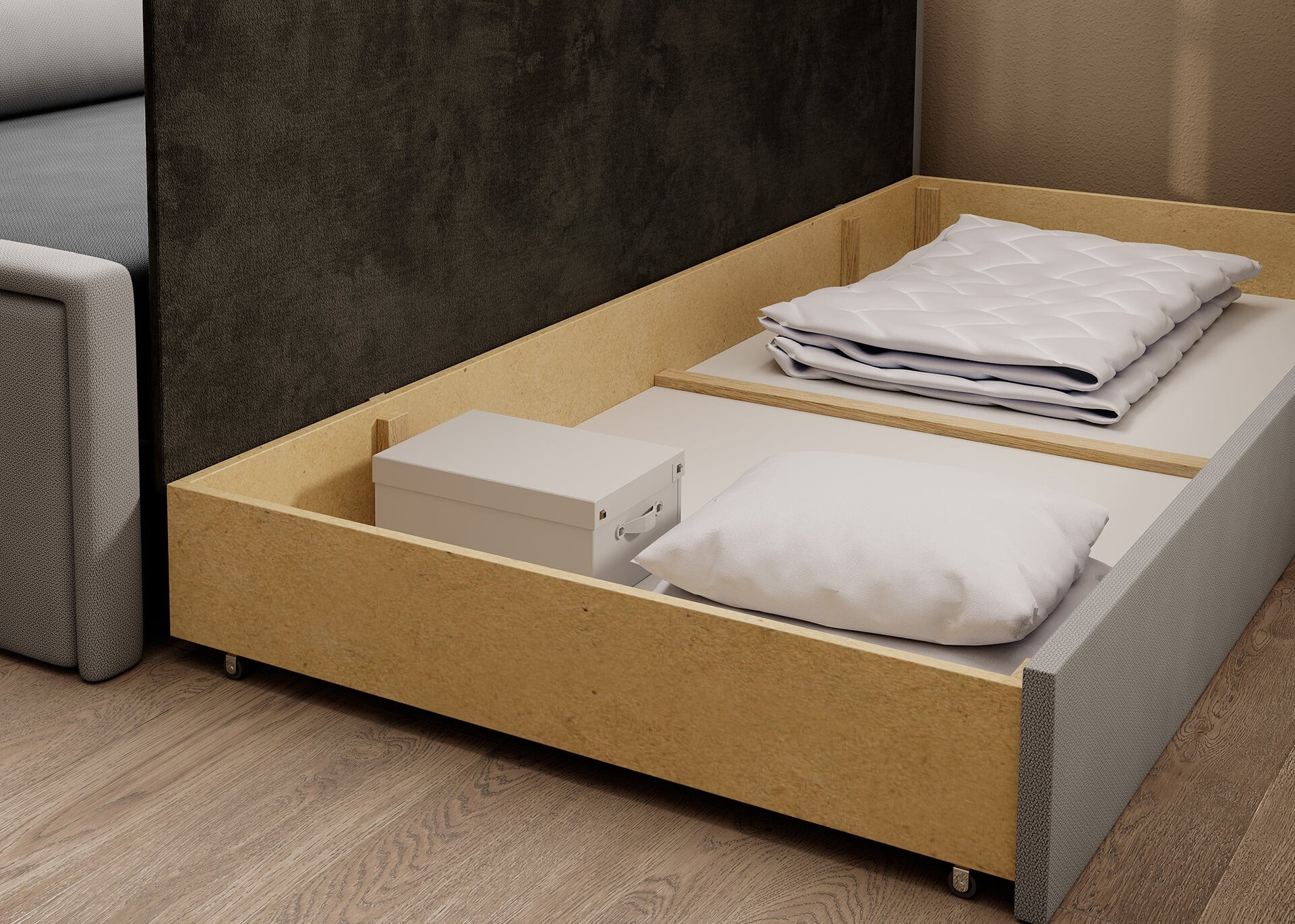 Jednou z hlavných predností tejto sedacej sústavy je jej multifunkčnosť. Vďaka možnosti rozkladania sa ľahko premení na pohodlné lôžko s plochou na spanie 150 x 200 cm, čo je ideálne pre hostí alebo pre tých, ktorí si radi doprajú popoludňajší odpočinok. Navyše je vybavená praktickým úložným priestorom, ktorý vám umožní ľahko uschovať deky, vankúše alebo iné predmety, ktoré chcete mať po ruke, ale zároveň ich mať úhľadne upratané.
