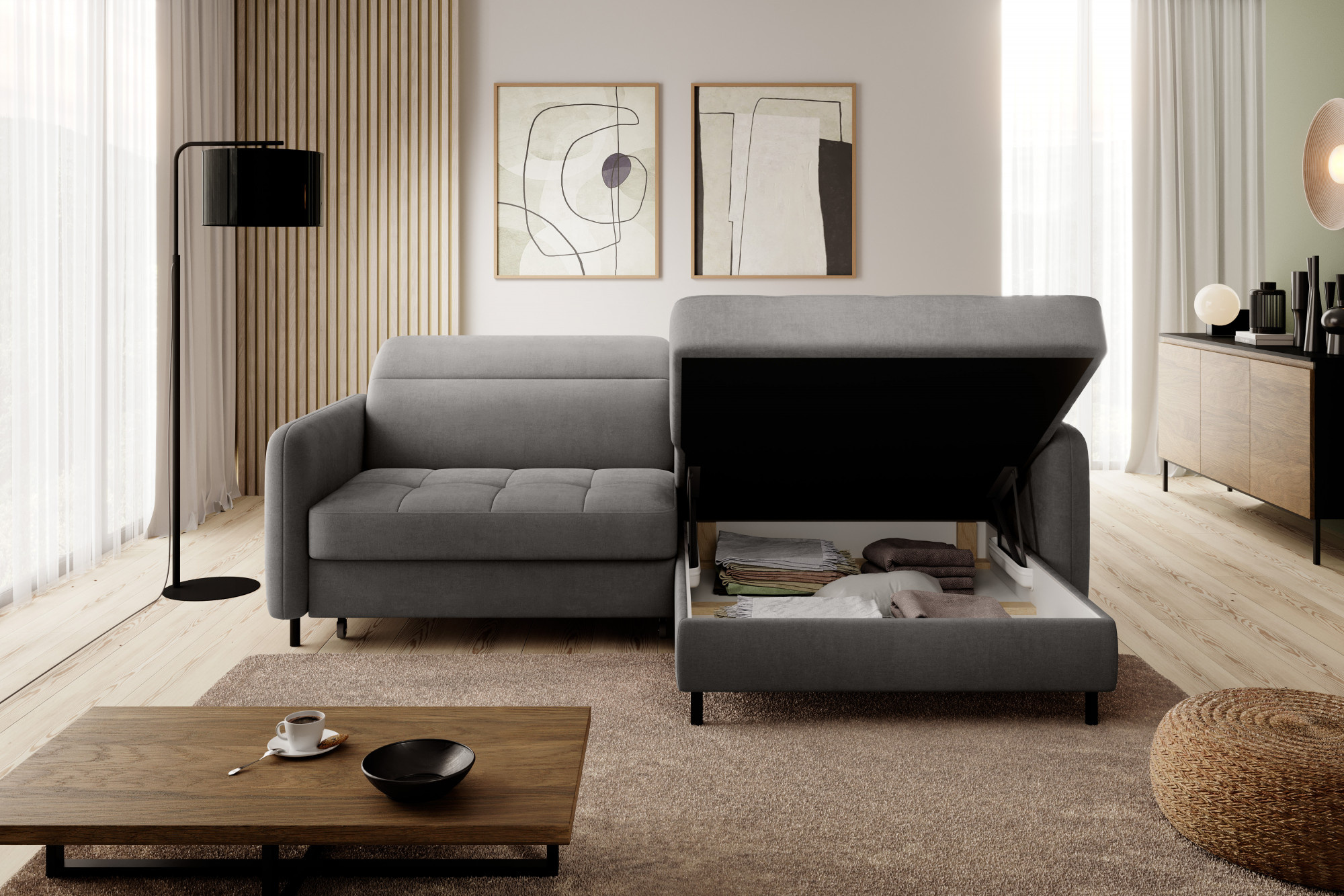 Táto rohová sedacia súprava je navrhnutá s ohľadom na vaše potreby. Disponuje praktickým úložným priestorom, ktorý vám umožní ľahko uschovať deky, vankúše alebo iné predmety, ktoré chcete mať po ruke, ale zároveň ich mať úhľadne upratané. Rozkladací mechanizmus premení sedaciu súpravu na pohodlné lôžko s plochou na spanie o rozmeroch 128 x 200 cm, čo je ideálne pre hostí alebo na príležitostné prespanie.