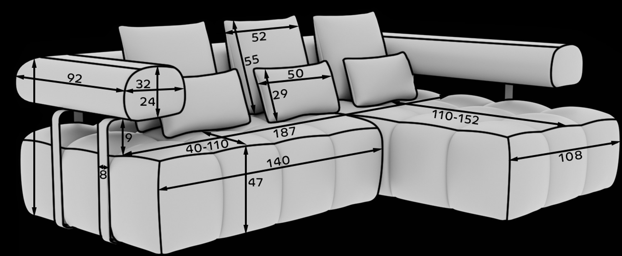 Jednou z hlavných predností tejto sedacej súpravy je jej rozkladacia funkcia. Ľahko ju premeníte na pohodlné lôžko s plochou na spanie 110 x 187 cm, čo je ideálne pre nečakaných hostí alebo pre tých, ktorí si radi doprajú popoludňajšiu siestu. Vďaka tejto funkcii sa stáva skvelou voľbou pre menšie byty, kde je potrebné efektívne využiť každý centimeter priestoru.