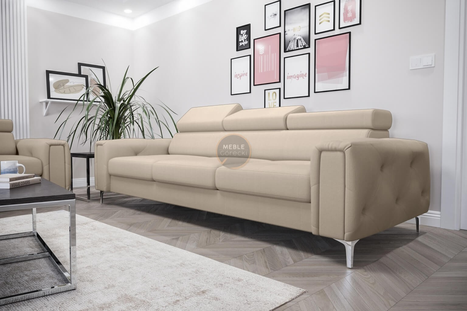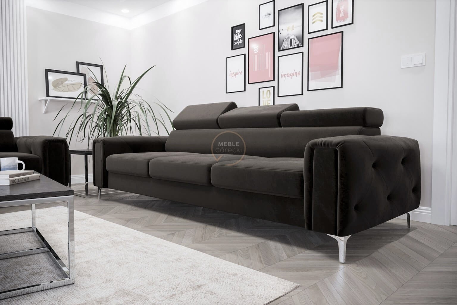 Kolekcia čalúneného nábytku Orion je niečo, čo nikde inde nenájdete! Charakteristickým prvkom sú krásne zdobené, prešívané boky v štýle glamour. Okrem estetických prvkov stojí za to venovať pozornosť dokončeniu v podobe nastaviteľných opierok hlavy, ktoré uľahčia prispôsobenie výšky operadla tak, aby bola pre vás ideálna. Vysoké 13 cm kovové nohy podčiarkujú celok a dodávajú konštrukcii ľahkosť.