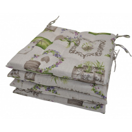 Súprava štyroch univerzálnych vankúšov na sedenie vyplnených dutým polyesterovým vláknom. | Rozmery sedacieho vankúša Alina sú 40x40 cm. Sedák je vyplnený dutým polyesterovým vláknom. Sedák je vybavený praktickými šnúrami na pripevnenie k stoličke. Sedák môžete použiť na bežné stoličky, plastový nábytok alebo záhradný nábytok. Šnúry na pripevnenie k stoličke sú vyrobené priamo z látky sedacieho vankúša, čím sa zabezpečí, že šnúry budú ladiť s celým sedacím vankúšom a výsledný efekt bude dokonalý.