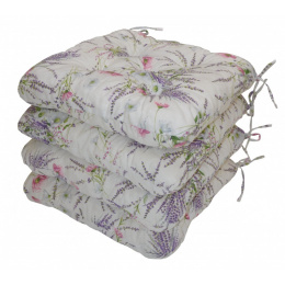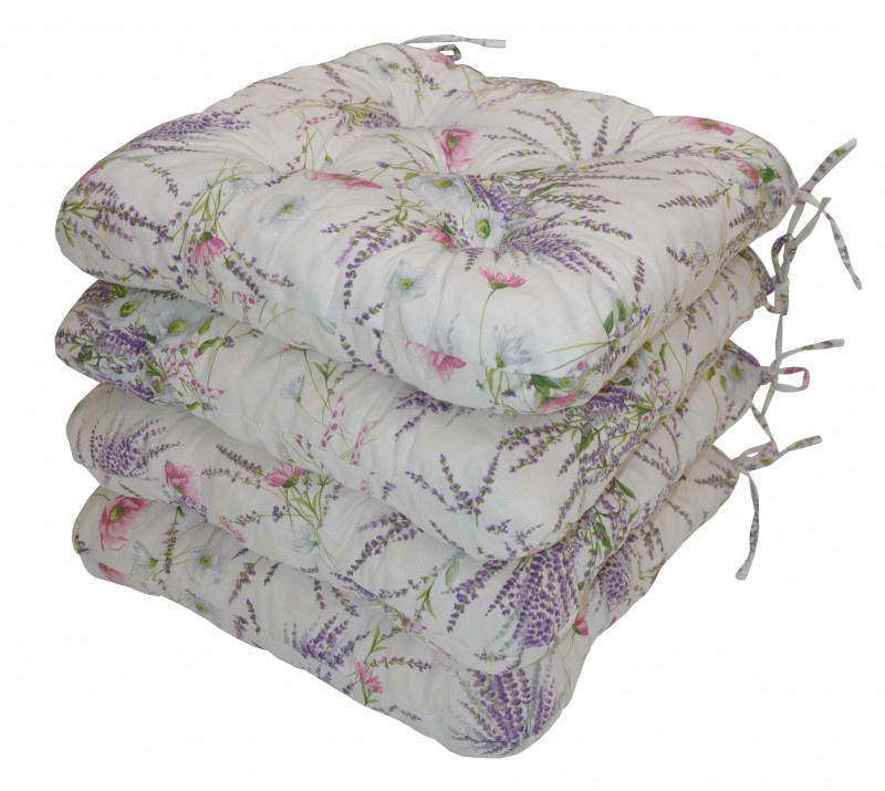 Sada štyroch univerzálnych vankúšov na sedenie vyplnených drvenou penou. | Praktické sedadlo stoličky vyplnené drvenou penou. Vďaka tomu si sedadlo zachová svoj tvar a výšku počas celého obdobia používania. Sedadlo má štvorcový tvar so zaoblenými rohmi. Rozmery vankúša na sedenie sú 42x42 cm. Výška sedadla je približne 7 cm. Sedák je vybavený praktickými šnúrami na pripevnenie k stoličke. Sedák môžete použiť na bežné stoličky, plastový nábytok alebo záhradný nábytok. Šnúry na pripevnenie k stoličke sú vyrobené priamo z látky sedacieho vankúša, čím sa zabezpečí, že šnúry budú ladiť s celým sedacím vankúšom a výsledný efekt bude dokonalý. Dĺžka šnúr je 30 cm a v každom rohu sú všité dve šnúry na jednoduché pripevnenie sedadla k stoličke. Šnúry sú dostatočne dlhé na to, aby ste ich mohli zaviazať okolo celého operadla (za stoličkou). Ďalšou výhodou je, že naše vankúše na sedenie je možné prať pri 40 stupňoch Celzia.