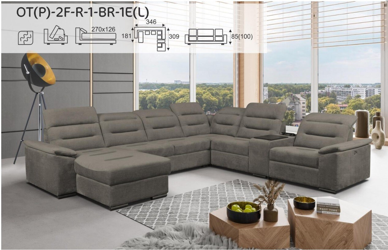 Súprava je navrhnutá v tvare písmena "U", čo umožňuje optimálne využitie priestoru a zároveň poskytuje dostatok miesta na pohodlné sedenie pre celú rodinu. So šírkou 346 cm, hĺbkou 309 cm a maximálnou výškou 100 cm je táto pohovka skvelým doplnkom do každej obývačky.
