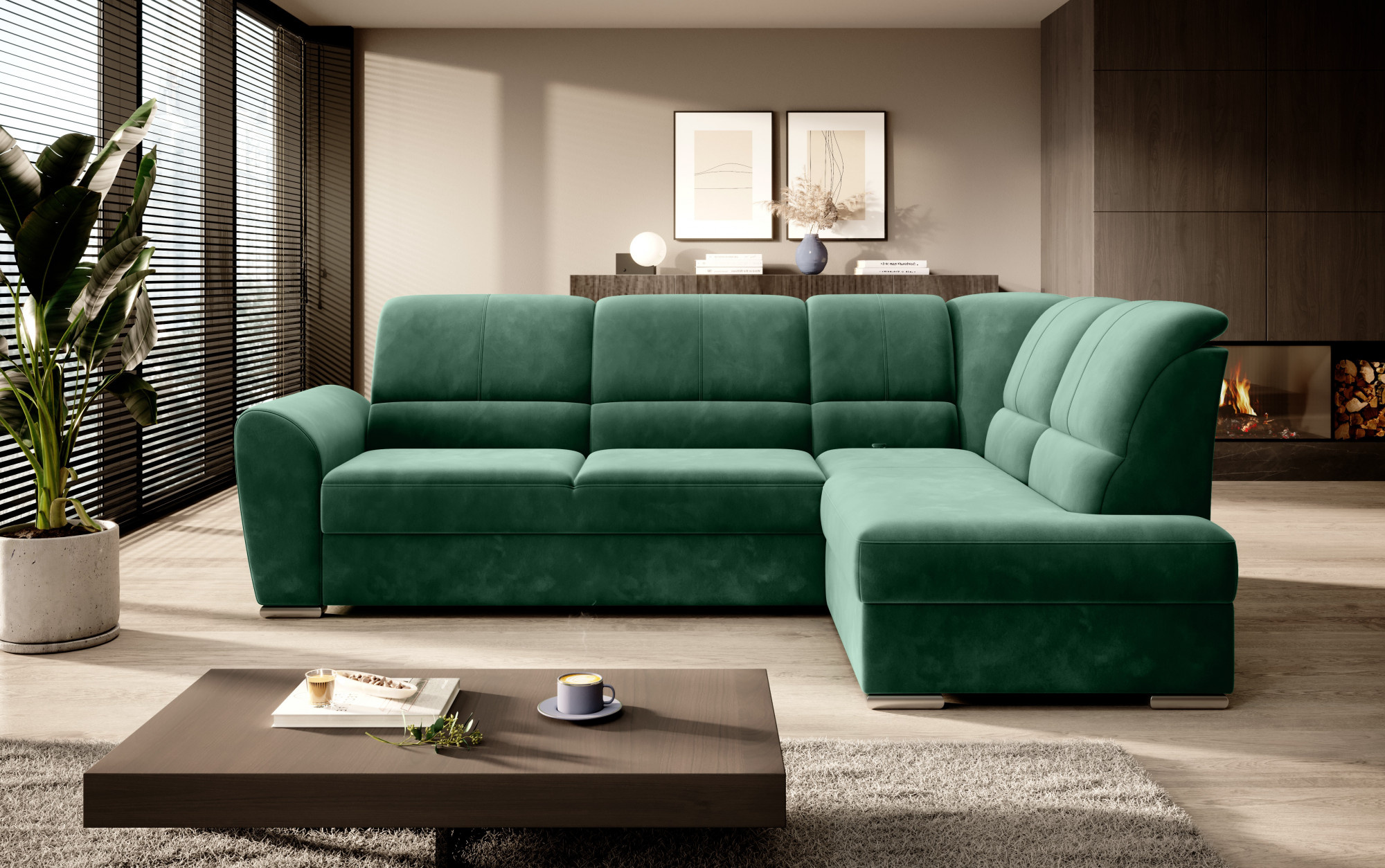 Rohová sedacia súprava Siber je ideálnym riešením pre tých, ktorí si cenia poriadok a organizáciu. Pomáha šetriť miesto vďaka veľkému úložnému priestoru na posteľnú bielizeň. Jeho vysoko profilované nastaviteľné opierky chrbta, zdobené štýlovým prešívaním, zabezpečia, že aj hodiny relaxácie pri vašom obľúbenom televíznom seriáli budú pohodlným a komfortným zážitkom. Rozmery rohovej sedacej súpravy: 270 x 186 x 93 cm, čo umožňuje pokojný odpočinok pre väčší počet ľudí bez nutnosti pridávať ďalší sedací nábytok. Okrem toho sa rohová sedačka môže stať ďalším lôžkom vďaka skladacej funkcii spania s plochou 205 x 125 cm. Mechanizmus skladania typu delfín použitý v tomto kuse nábytku je skvelý a jednoduchý spôsob, ako premeniť rohovú pohovku na plnohodnotnú posteľ. Za zmienku stoja aj nastaviteľné opierky chrbta, ktoré vám môžu pomôcť pohodlne relaxovať pri čítaní knihy alebo sledovaní televízie. Zaujímavými prvkami tohto kusu nábytku sú jeho 5 cm vysoké drevené nohy a tiež sedák vyplnený penou T30, ktorá poskytuje vynikajúcu pružnosť a vysokú hustotu.