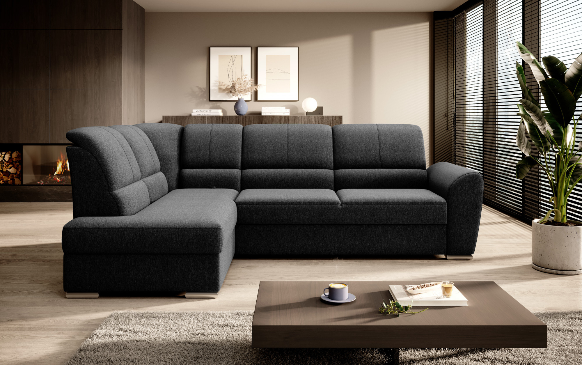 Rohová sedacia súprava Siber je ideálnym riešením pre tých, ktorí si cenia poriadok a organizáciu. Pomáha šetriť miesto vďaka veľkému úložnému priestoru na posteľnú bielizeň. Jeho vysoko profilované nastaviteľné opierky chrbta, zdobené štýlovým prešívaním, zabezpečia, že aj hodiny relaxácie pri vašom obľúbenom televíznom seriáli budú pohodlným a komfortným zážitkom. Rozmery rohovej sedacej súpravy: 270 x 186 x 93 cm, čo umožňuje pokojný odpočinok pre väčší počet ľudí bez nutnosti pridávať ďalší sedací nábytok. Okrem toho sa rohová sedačka môže stať ďalším lôžkom vďaka skladacej funkcii spania s plochou 205 x 125 cm. Mechanizmus skladania typu delfín použitý v tomto kuse nábytku je skvelý a jednoduchý spôsob, ako premeniť rohovú pohovku na plnohodnotnú posteľ. Za zmienku stoja aj nastaviteľné opierky chrbta, ktoré vám môžu pomôcť pohodlne relaxovať pri čítaní knihy alebo sledovaní televízie. Zaujímavými prvkami tohto kusu nábytku sú jeho 5 cm vysoké drevené nohy a tiež sedák vyplnený penou T30, ktorá poskytuje vynikajúcu pružnosť a vysokú hustotu.