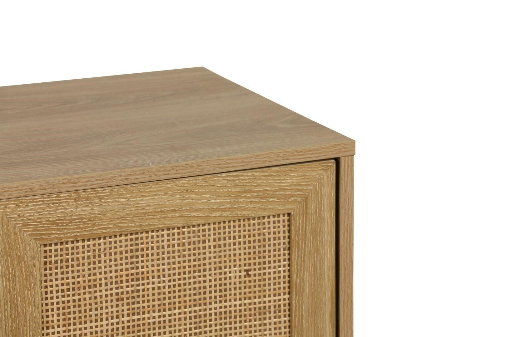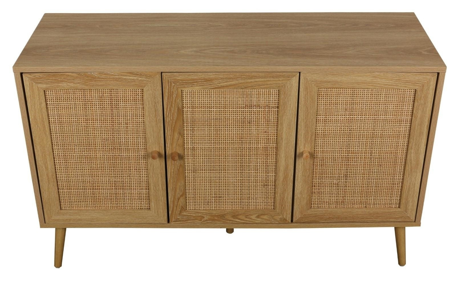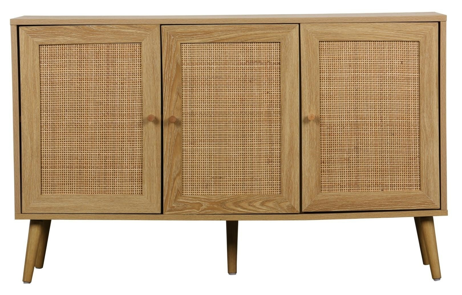 Komoda s 3 čelami zo série Ballo je moderný nábytok v prírodnom boho štýle. Minimalistická konštrukcia ozdobená prírodnými materiálmi ako ratan alebo masívne drevo sa osvedčí v interiéri zladenom s prírodnými farbami. Jasná skrinka v teplom odtieni dreva sa ideálne hodí do béžového interiéru. Materiál korpusu: drevotriesková doska laminovaná papierovým laminátom imitujúcim prírodnú farbu duba. Nohy komody vyrobené z masívneho borovicového dreva. Ratanová dekorácia čel. Vyžaduje montáž. Maximálne zaťaženie nábytku 50 kg. Rozmery kartónu: 45x14x122 cm
