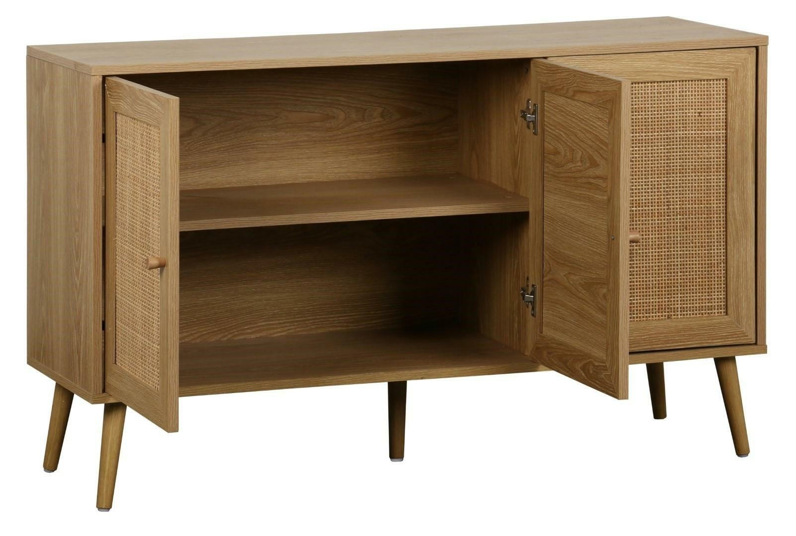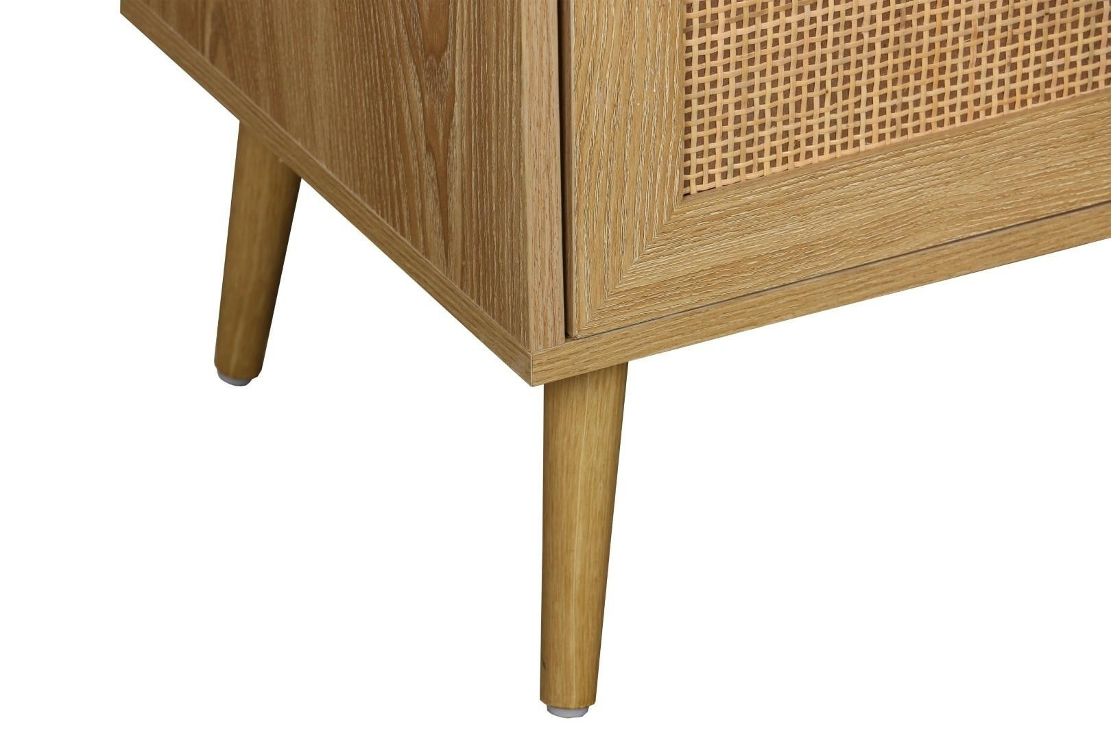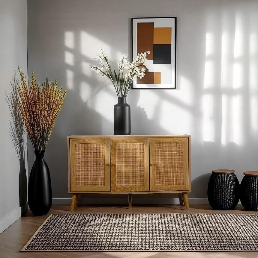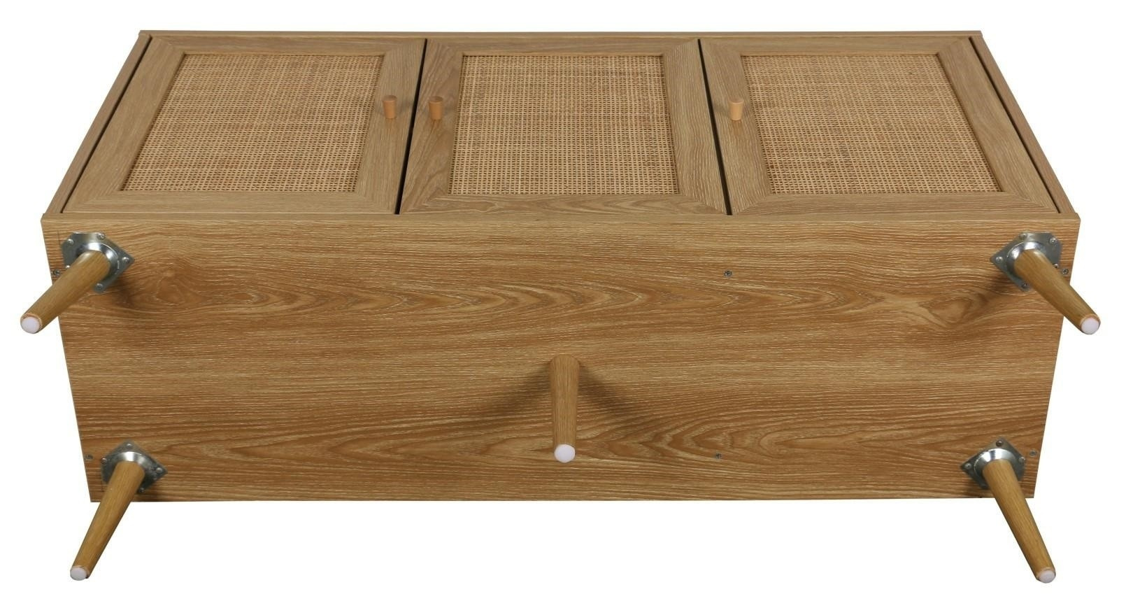 Komoda s 3 čelami zo série Ballo je moderný nábytok v prírodnom boho štýle. Minimalistická konštrukcia ozdobená prírodnými materiálmi ako ratan alebo masívne drevo sa osvedčí v interiéri zladenom s prírodnými farbami. Jasná skrinka v teplom odtieni dreva sa ideálne hodí do béžového interiéru. Materiál korpusu: drevotriesková doska laminovaná papierovým laminátom imitujúcim prírodnú farbu duba. Nohy komody vyrobené z masívneho borovicového dreva. Ratanová dekorácia čel. Vyžaduje montáž. Maximálne zaťaženie nábytku 50 kg. Rozmery kartónu: 45x14x122 cm