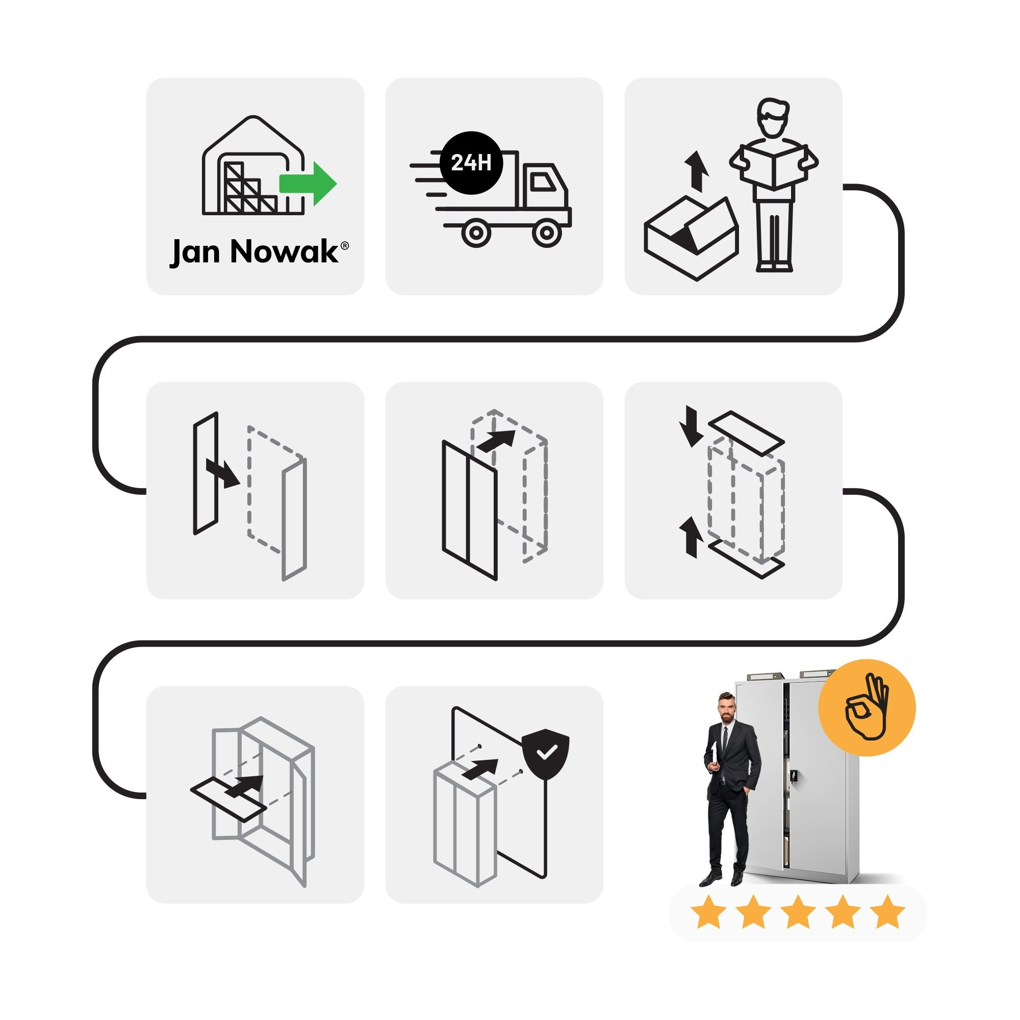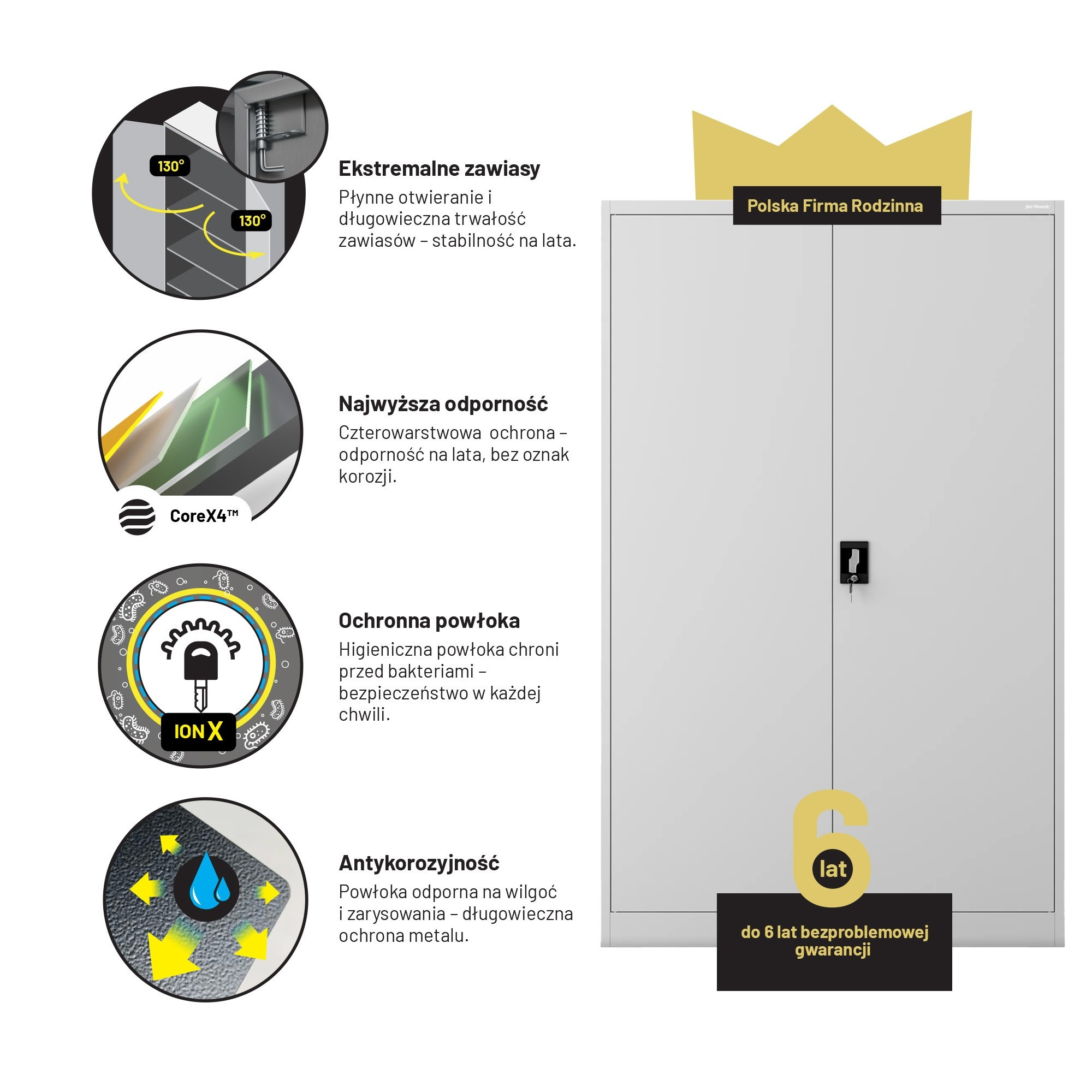 Skriňa JAN II je vyrobená z kvalitnej ocele o hrúbke 0,6 mm a ošetrená práškovým lakovaním, ktoré zaisťuje vysokú odolnosť proti mechanickému poškodeniu, korózii a opotrebovaniu. Vďaka tomu vám bude skriňa slúžiť spoľahlivo po mnoho rokov.