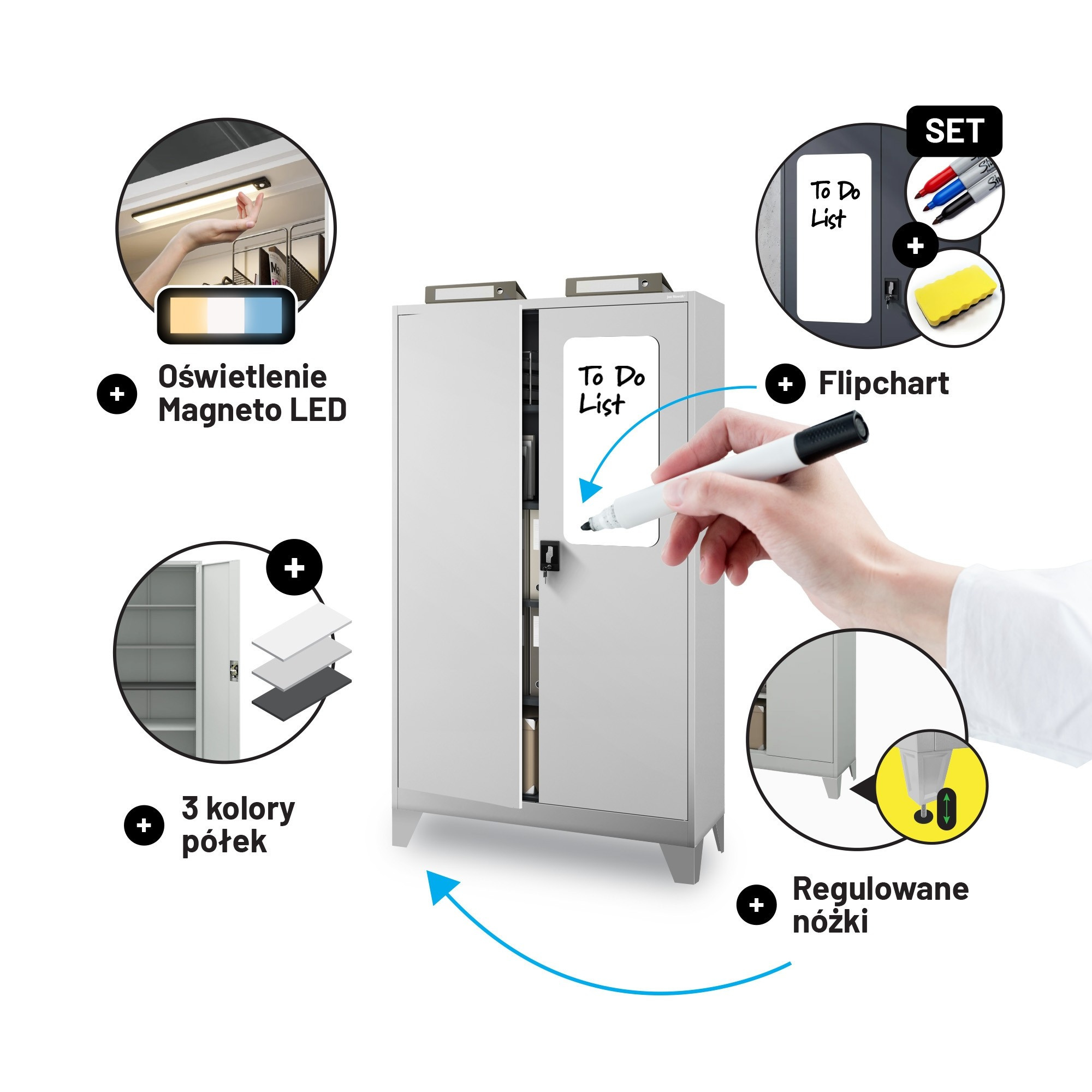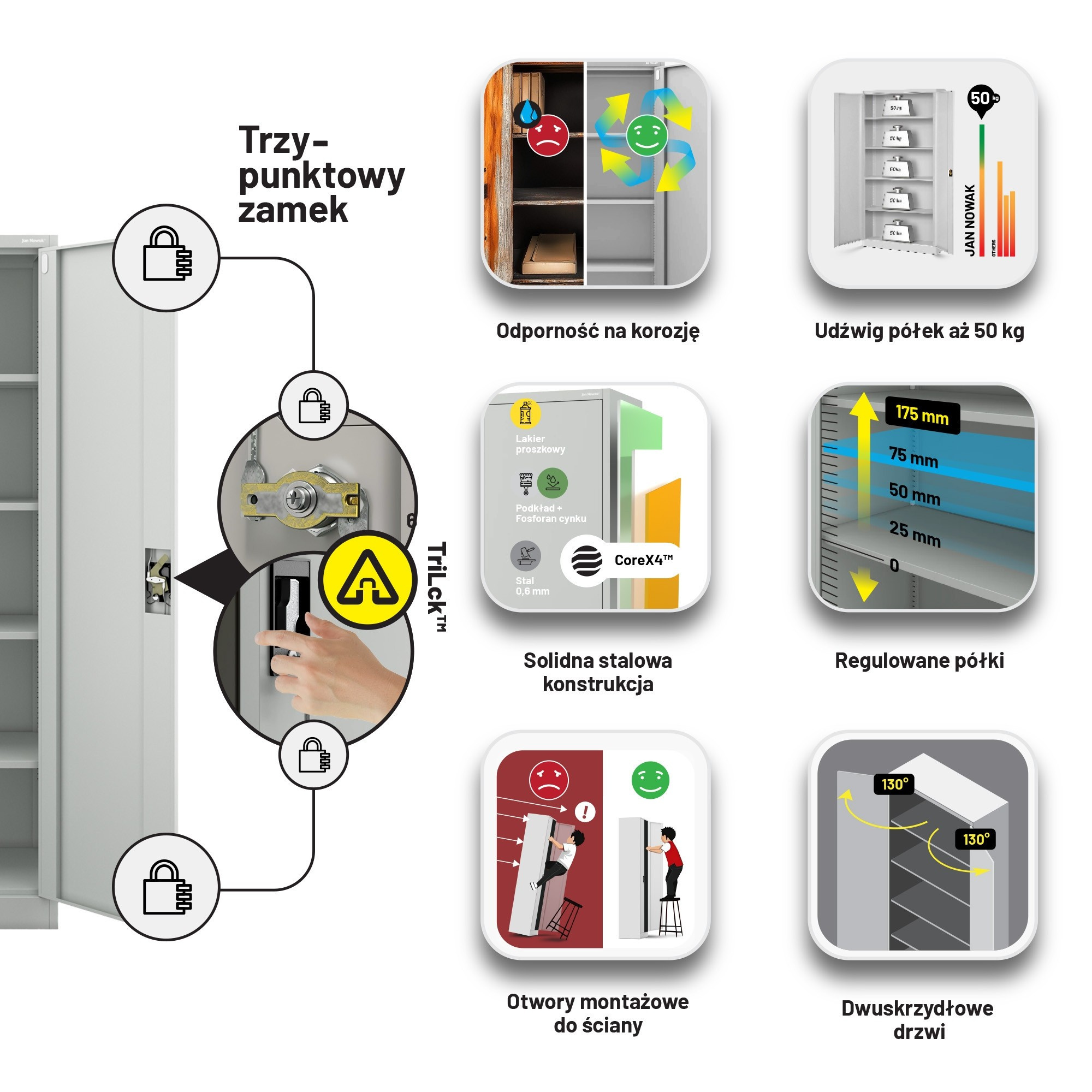 Je to spoľahlivé riešenie pre uskladnenie dokumentov, náradia, zdravotníckeho vybavenia a ďalších predmetov, ktoré potrebujete mať bezpečne a usporiadane uložené. Vďaka svojmu univerzálnemu dizajnu a robustnej konštrukcii sa stane nepostrádateľným prvkom vašej kancelárie, dielne, ordinácie alebo aj moderného domova.Vyberte si skriňu JAN II a získajte spoľahlivého partnera pre uskladnenie vašich cenností!