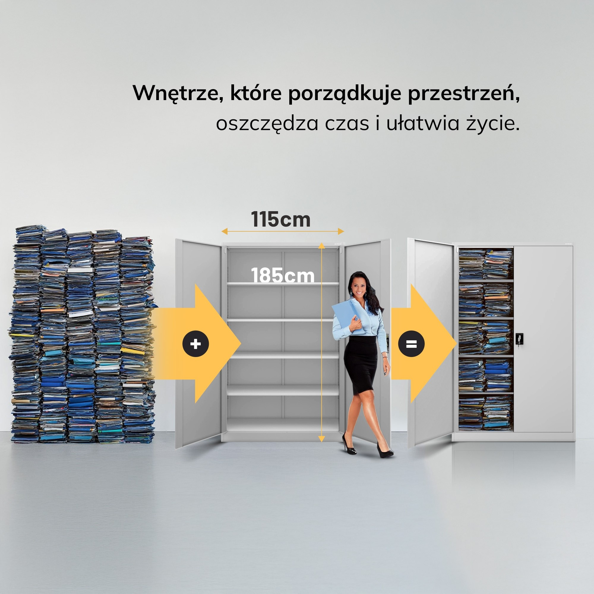 Hľadáte spoľahlivé a elegantné riešenie pre uskladnenie dokumentov, náradia, zdravotníckeho vybavenia alebo čohokoľvek iného, čo potrebujete mať bezpečne a usporiadane uložené? Predstavujeme vám skriňu JAN II – robustnú oceľovú skriňu v nadčasovom sivom prevedení, ktorá sa stane nepostrádateľným prvkom vašej kancelárie, dielne, ordinácie alebo aj moderného domova.