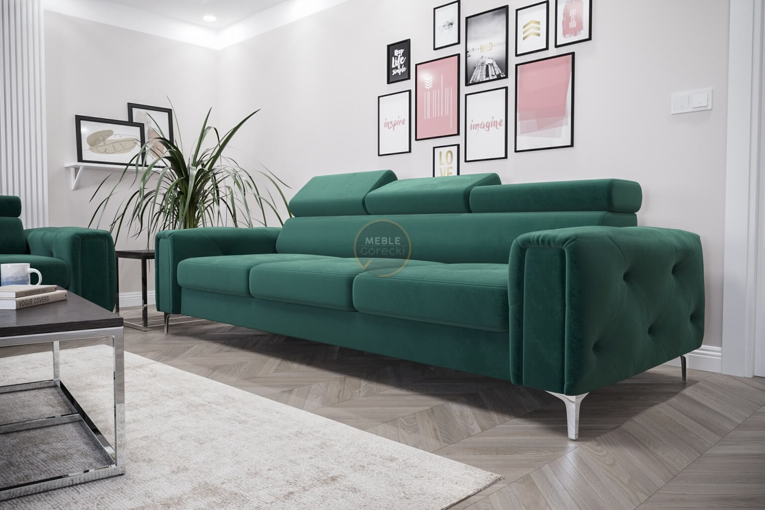 Kolekcia čalúneného nábytku Orion je niečo, čo nikde inde nenájdete! Charakteristickým prvkom sú krásne zdobené, prešívané boky v štýle glamour. Okrem estetických prvkov stojí za to venovať pozornosť dokončeniu v podobe nastaviteľných opierok hlavy, ktoré uľahčia prispôsobenie výšky operadla tak, aby bola pre vás ideálna. Vysoké 13 cm kovové nohy podčiarkujú celok a dodávajú konštrukcii ľahkosť.