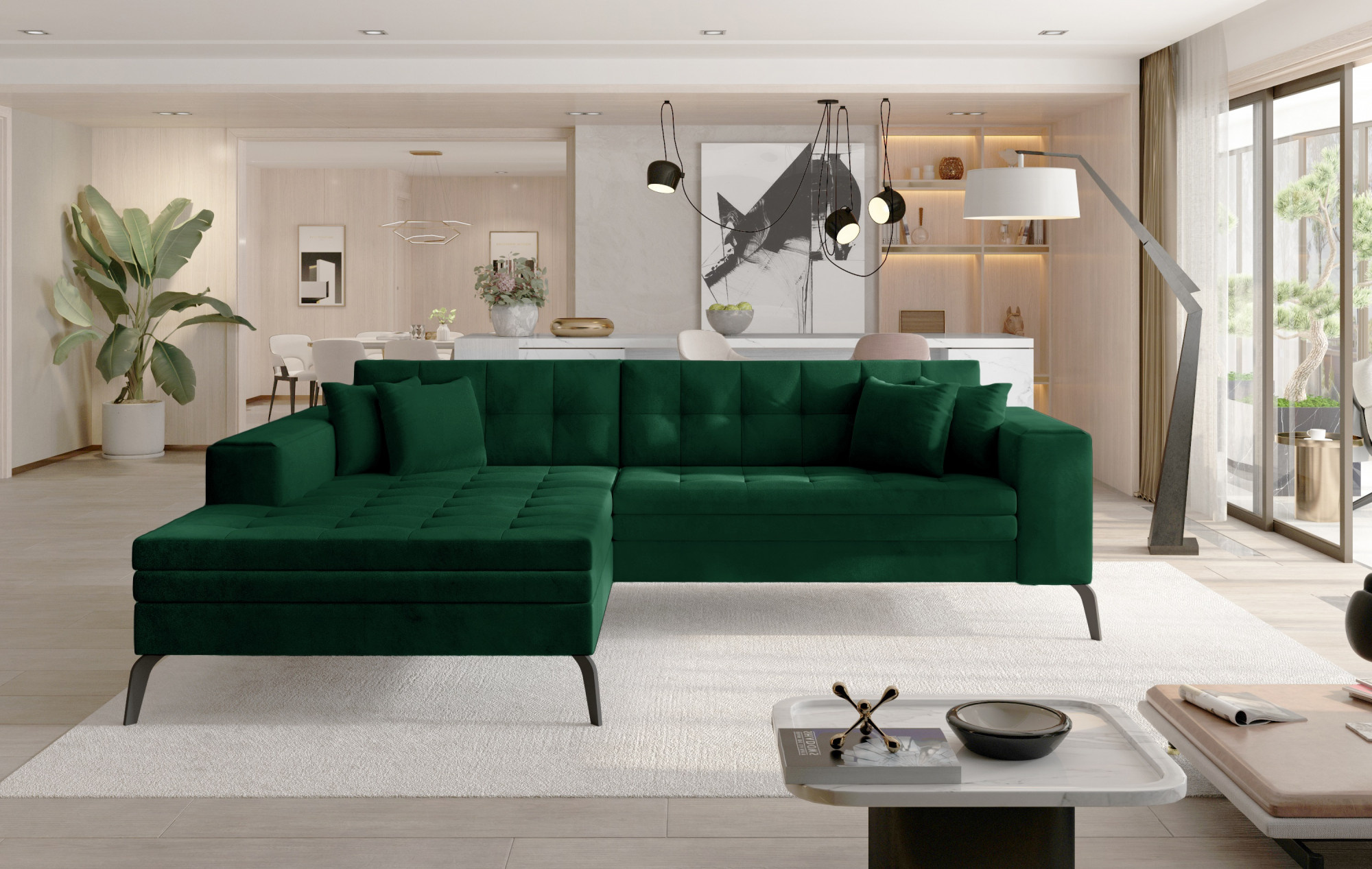 Solange je originálna, vkusná a mimoriadne mäkká rohová súprava, ktorá prináša do interiéru, v ktorom sa nachádza, závan sviežosti a luxusu. Tento kus nábytku s rozmermi 292 x 196 x 80 cm zaručuje maximálne pohodlie pre celú rodinu na odpočinok ako počas dňa, tak aj v noci, pretože je vybavený funkciou spania s plochou 210 x 126 cm. Existuje tiež mechanizmus delfín, ktorý pomáha ľahko rozložiť kus nábytku do požadovanej polohy. Hlboké sedadlá s dlhou otomanou, vyplnené vlnovou pružinou a penou T30, umožňujú nielen udržiavať správne držanie tela, ale tiež vďaka nim je náš nábytok odolný voči deformáciám. Rohová rozkladacia pohovka je k dispozícii v širokej škále farieb, čo vám poskytuje mnoho možností, ako si vybrať kus nábytku a zariadiť obývačku vo vašom vlastnom individuálnom štýle.