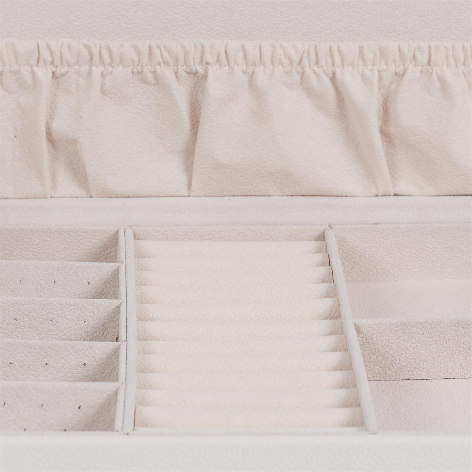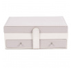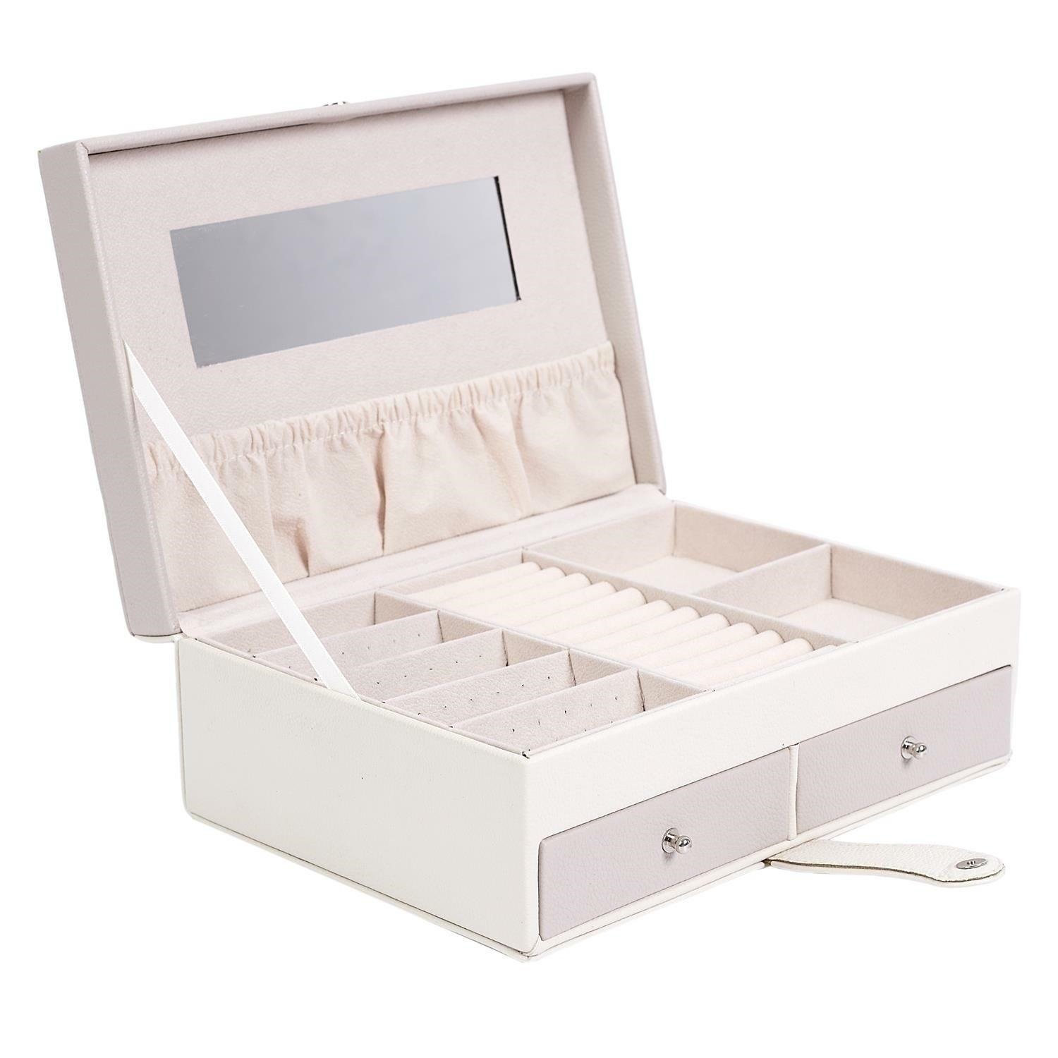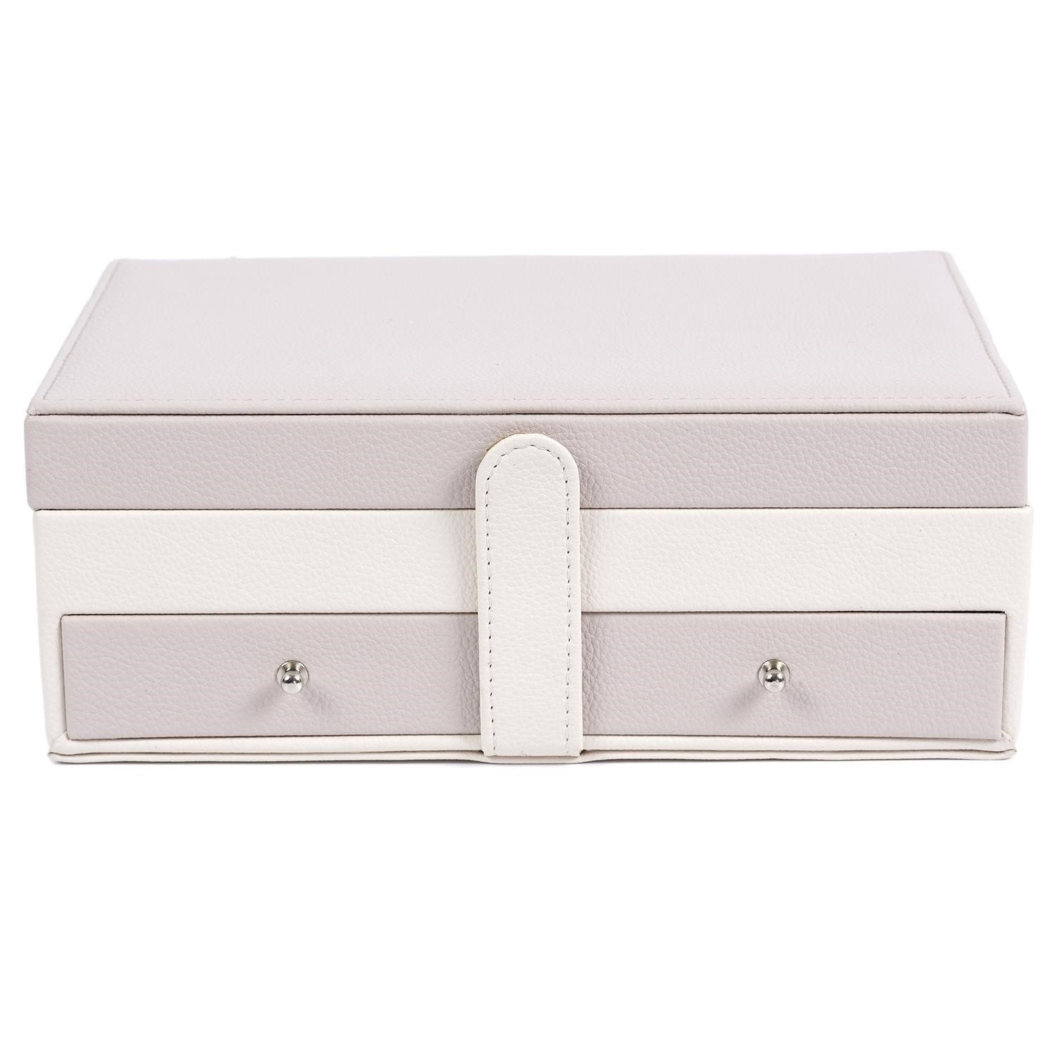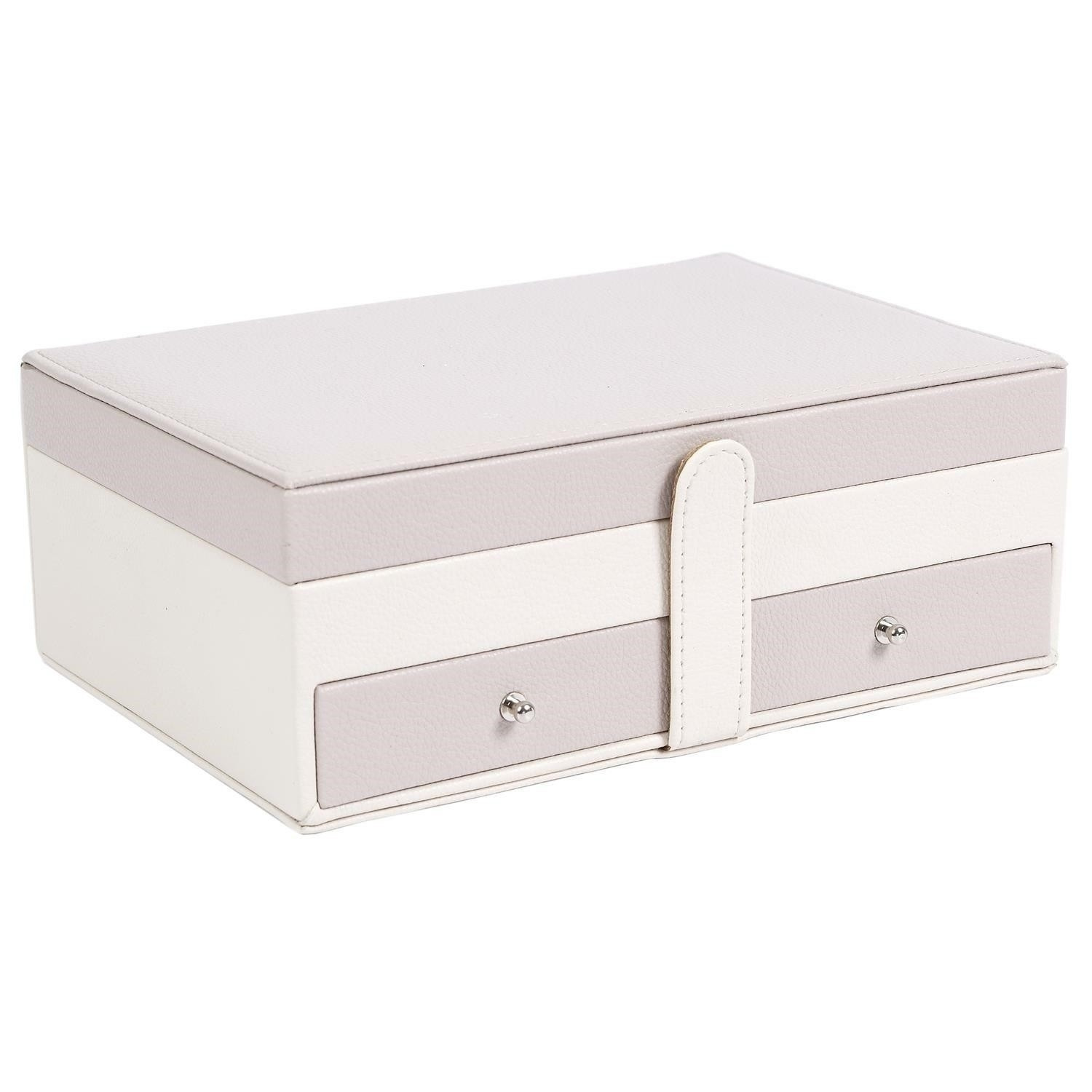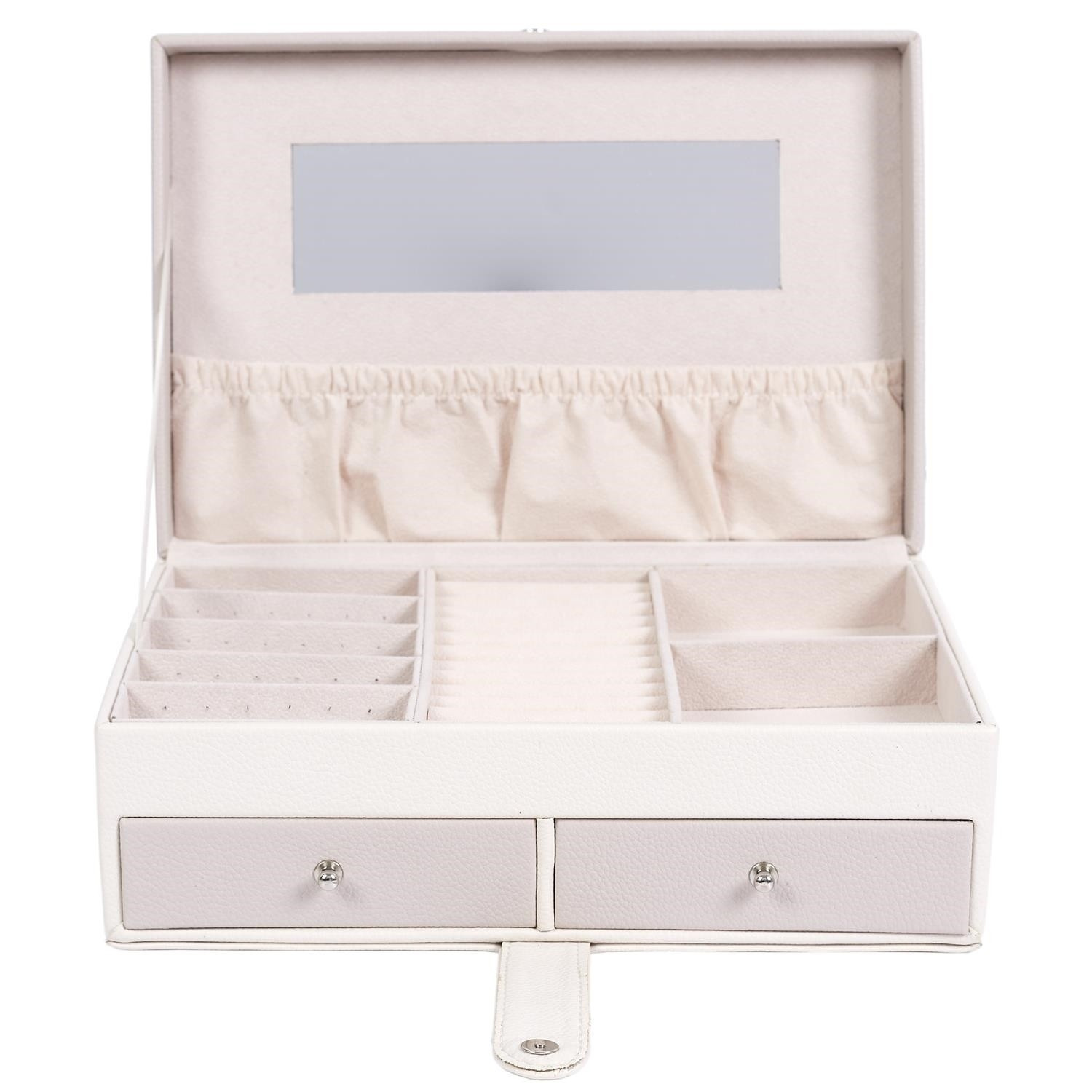 Šperkovnica Lady je všetko, čo potrebujete na udržanie poriadku a organizácie medzi svojimi šperkami. Má mnoho priehradiek na prstene, náušnice alebo náramky. Vo vnútri je vystlaná príjemnou na dotyk tkaninou. Jeho prednosti zahŕňajú aj dve priestranné zásuvky, vnútorné zrkadielko a tiež dodatočné vrecko na veku. Šperkovnica pokrytá ekologickou kožou je uzatvárateľná na pohodlný západkový uzáver. Počet kartónov: 1 Rozmery kartónov: 25x9,5x17cm