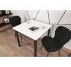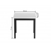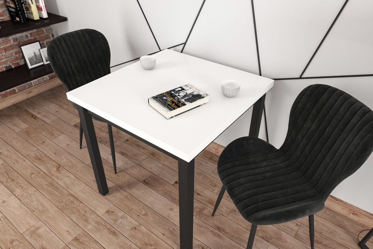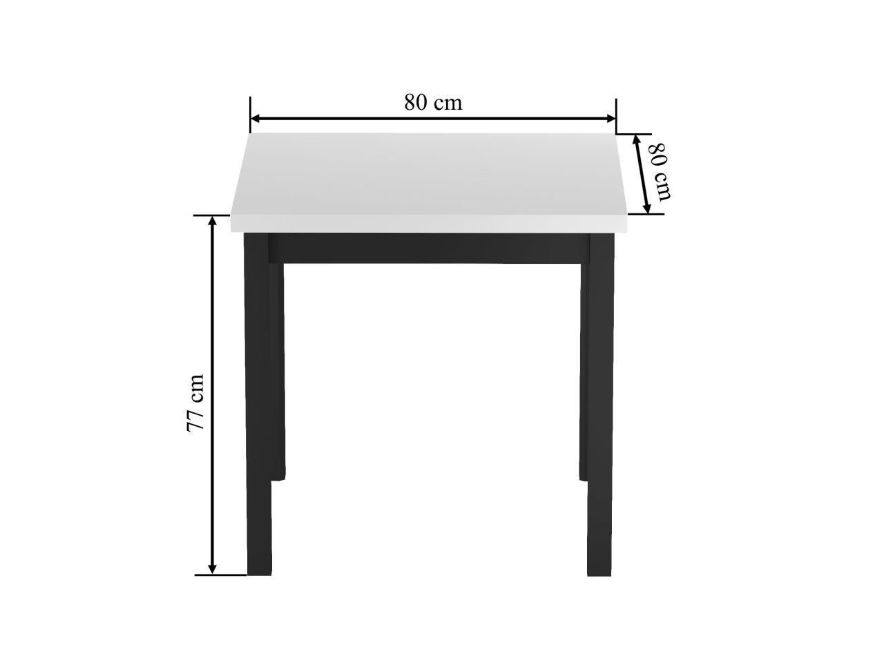 Rozmery: - dĺžka: 80 cm - šírka: 80 cm - výška: 77 cm - hrúbka dosky: 3,8 cm Materiál: - doska: laminovaná drevotrieska - nohy: MDF - hrany dosky: zakončené ABS plastom Farba: - biela + čierna