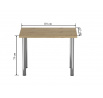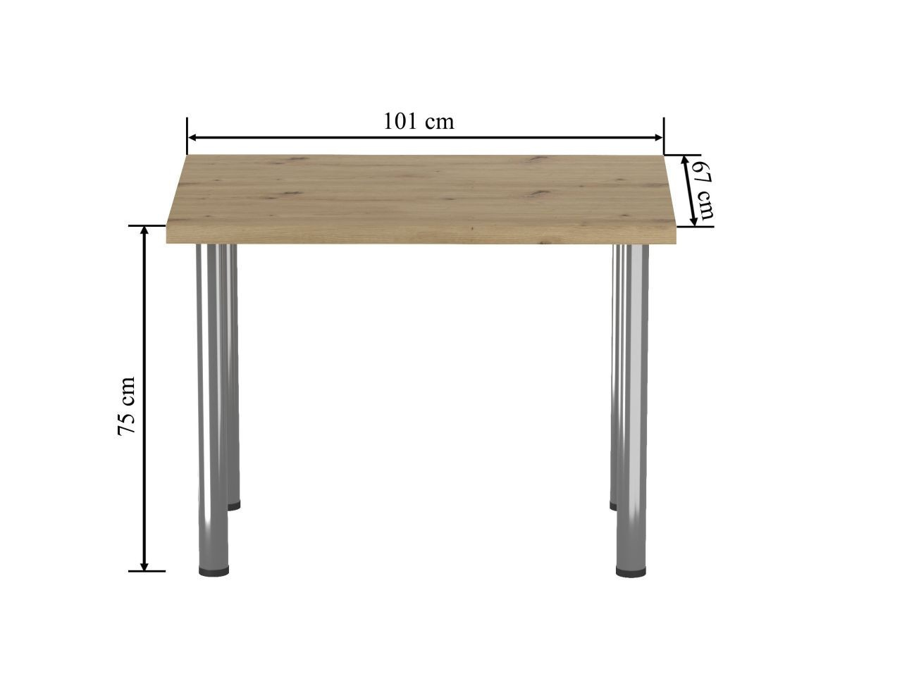 Rozmery: - dĺžka: 101 cm - šírka: 67 cm - výška: 75 cm - hrúbka dosky: 3,8 cm Materiál: - doska: laminovaná doska - hrany dosky: zakončené ABS plastom - nohy: chrómovaná oceľ Farba: - doska: dub artisan - nohy: chróm