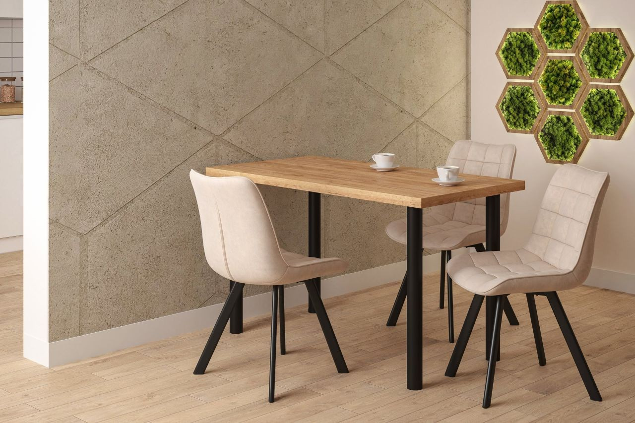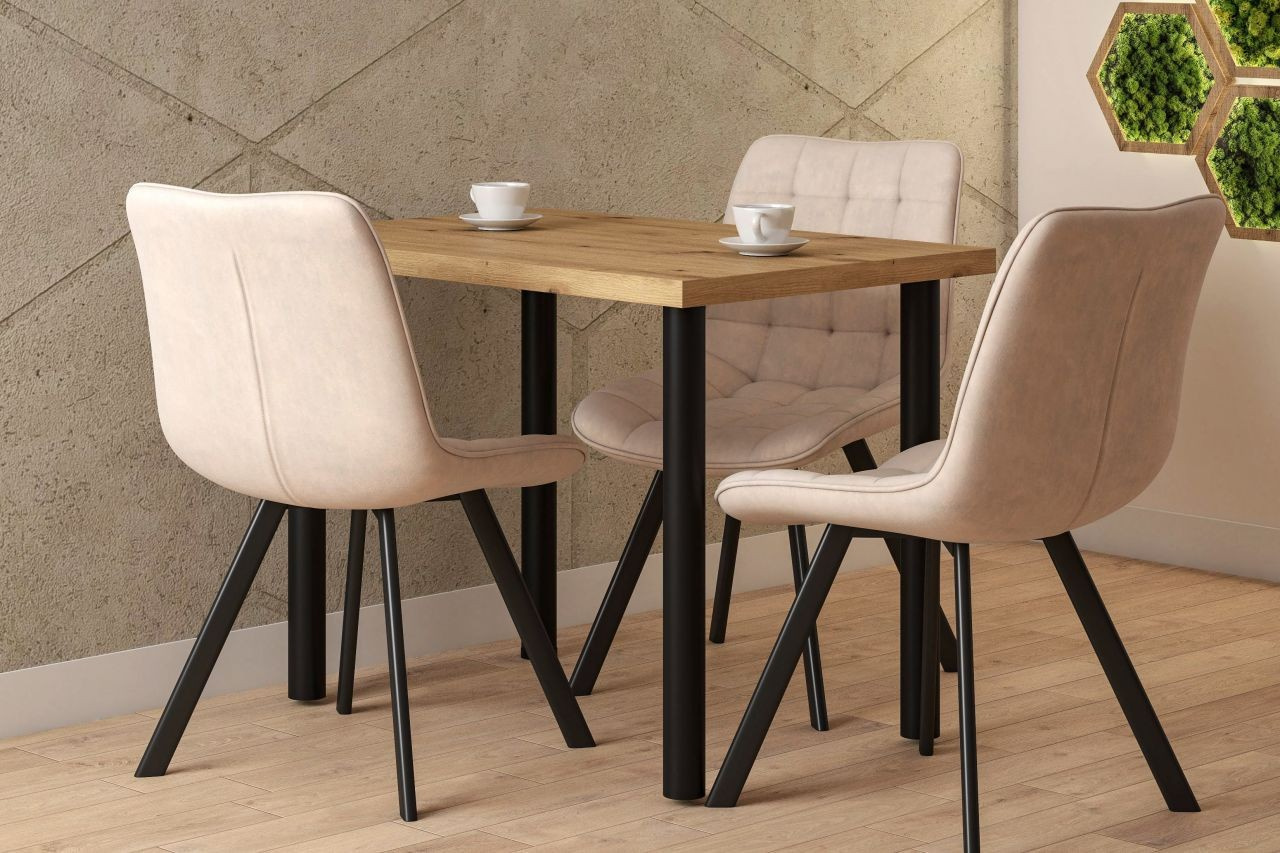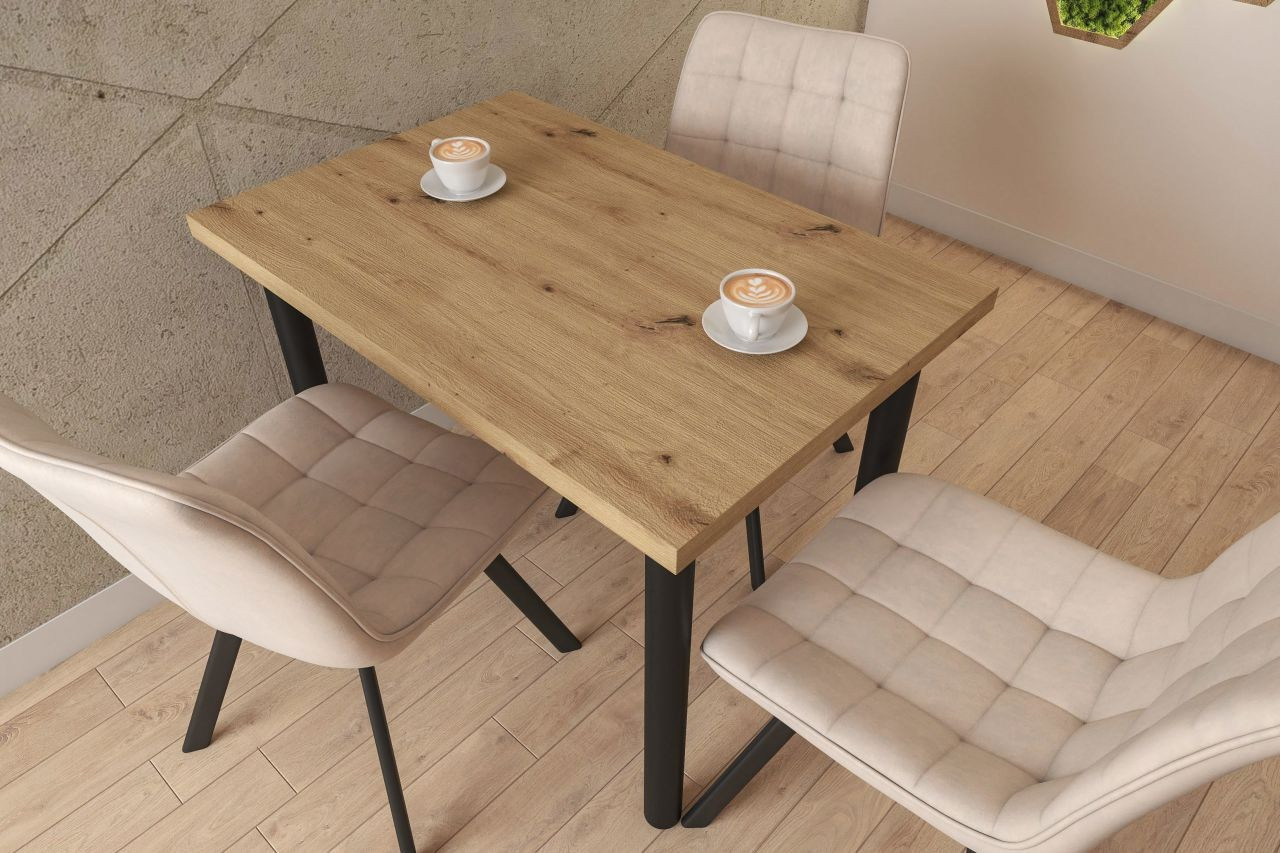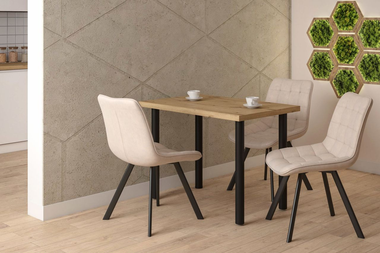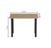 Rozmery: - dĺžka: 101 cm - šírka: 67 cm - výška: 75 cm - hrúbka dosky: 3,8 cm Materiál: - doska: laminovaná doska - hrany dosky: zakončené ABS plastom - nohy: oceľ lakovaná práškovou farbou Farba: - doska: dub artisan - nohy: čierna