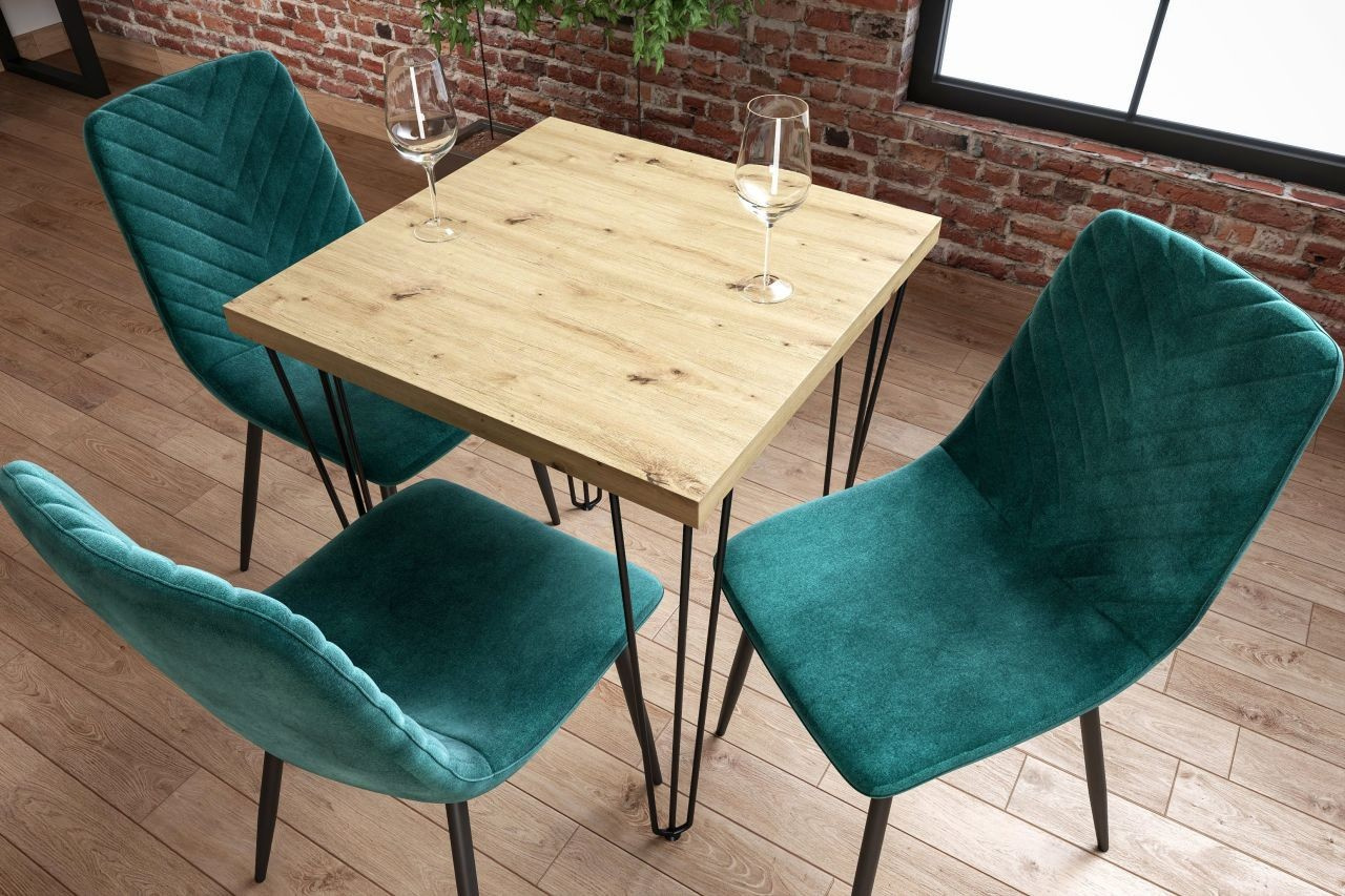 Rozmery: - dĺžka: 67 cm - šírka: 67 cm - výška: 76 cm - hrúbka dosky: 3,8 cm Materiál: - doska: laminovaná doska - hrany dosky: zakončené ABS plastom - nohy: oceľ lakovaná práškovou farbou Farba: - doska: dub artisan - nohy: čierna