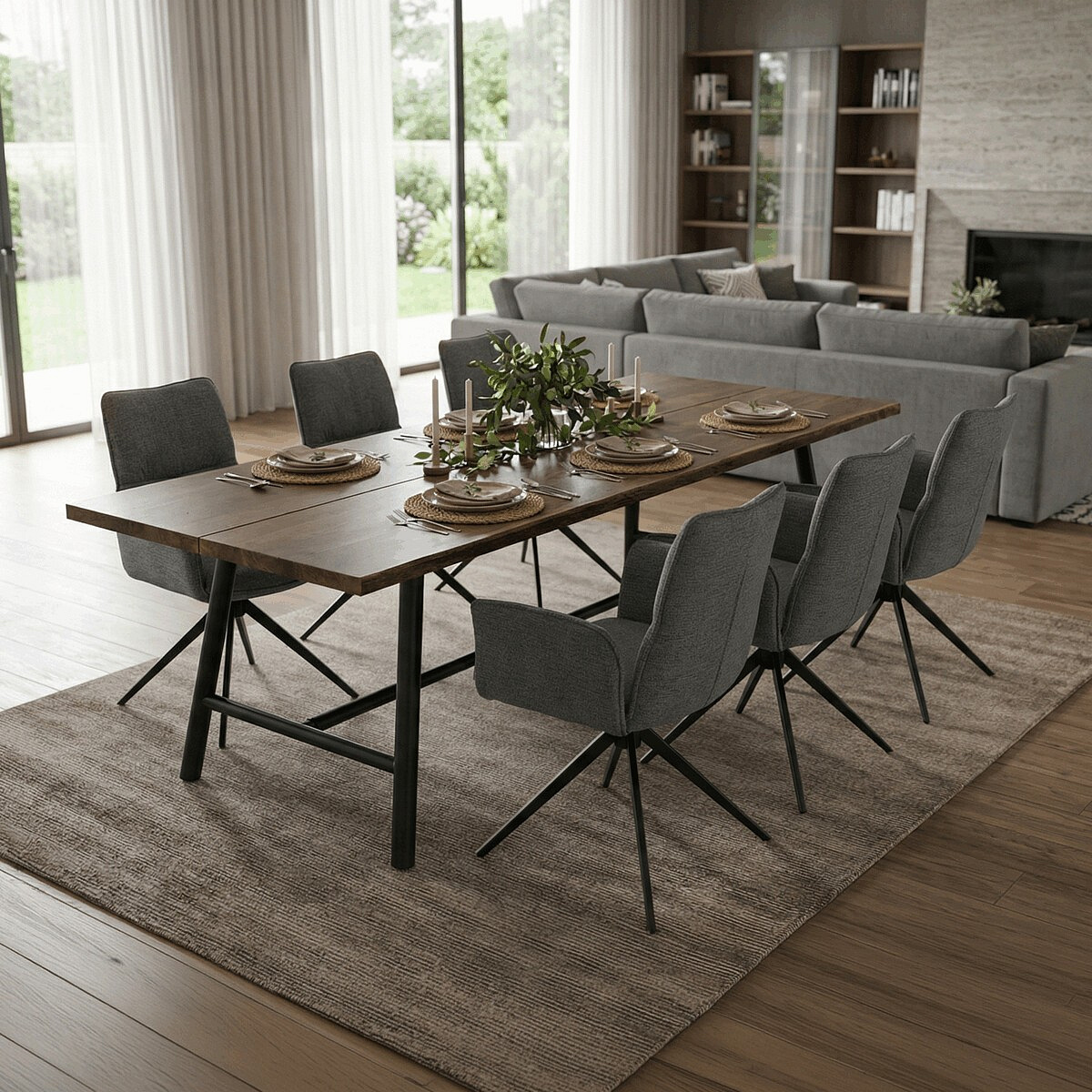 Jedálenský stôl značky Autronic v industriálnom štýle je skvelou voľbou pre veľké rodinné večere. Jeho priestranná dyhová doska v dekore orecha dodáva interiéru teplý a prírodný nádych, zatiaľ čo čierne kovové nohy zaisťujú stabilitu a odolnosť. Obdĺžnikový tvar a matný povrch podčiarkujú moderný vzhľad stola. Vďaka robustnej konštrukcii sa hodí do priestrannejších jedální, kde sa stane centrálnym prvkom. Stôl sa skladá z dvoch samostatných kusov dosky, čo podčiarkuje jeho nadčasový dizajn.