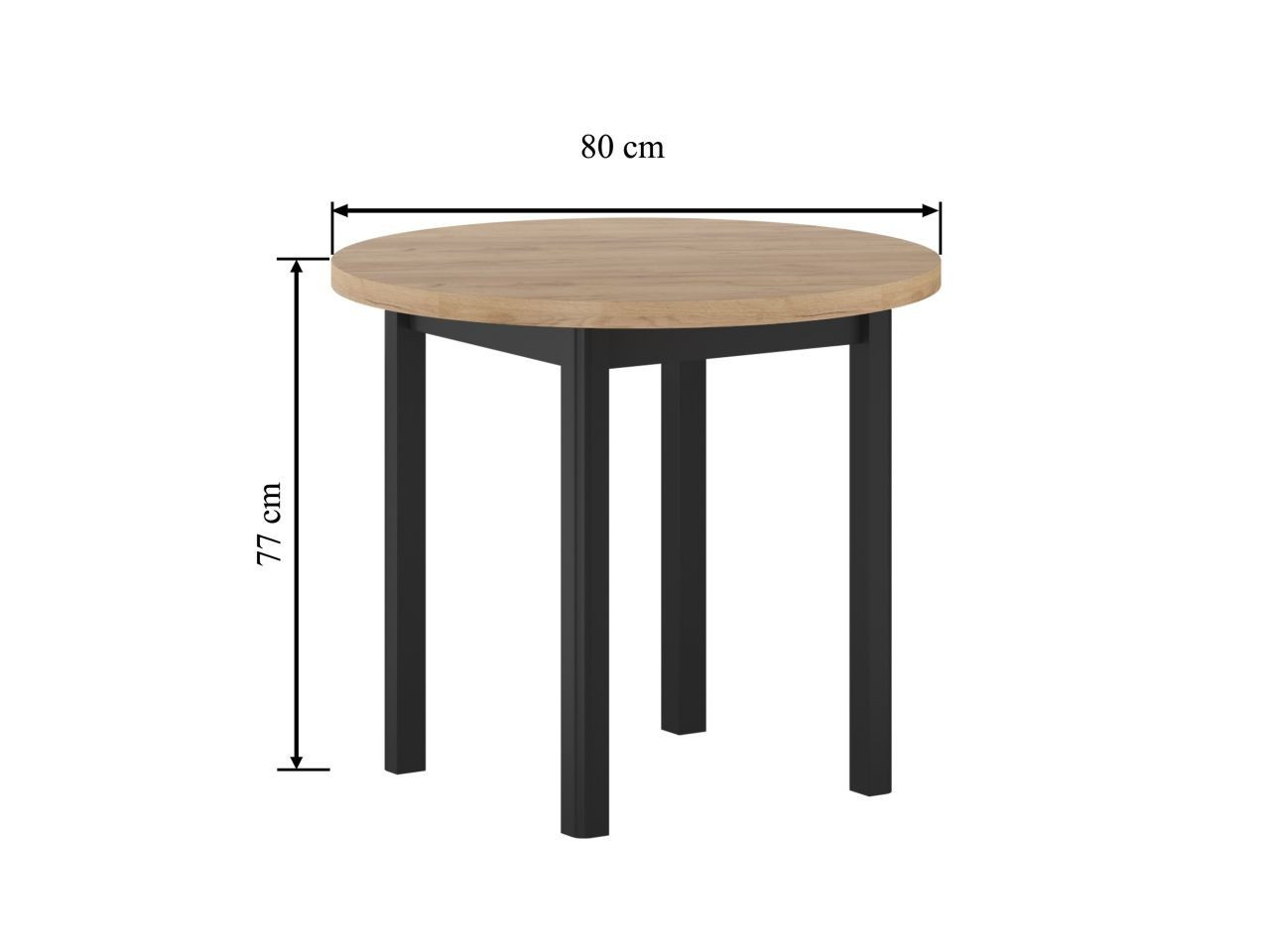 Rozmery: - priemer: 80 cm - výška: 77 cm - hrúbka dosky: 3,8 cm Materiál: - doska: laminovaná drevotrieska - nohy: MDF - hrany dosky: zakončené ABS plastom Farba: - zlatý dub craft + čierna