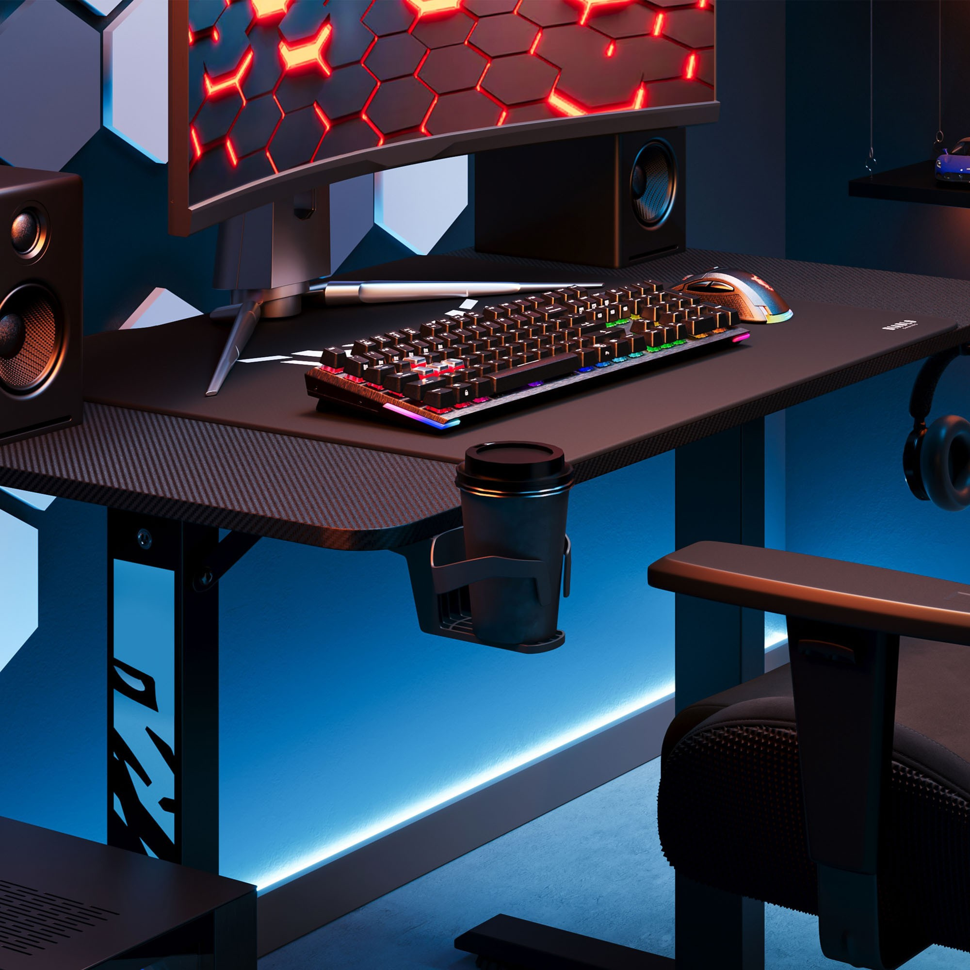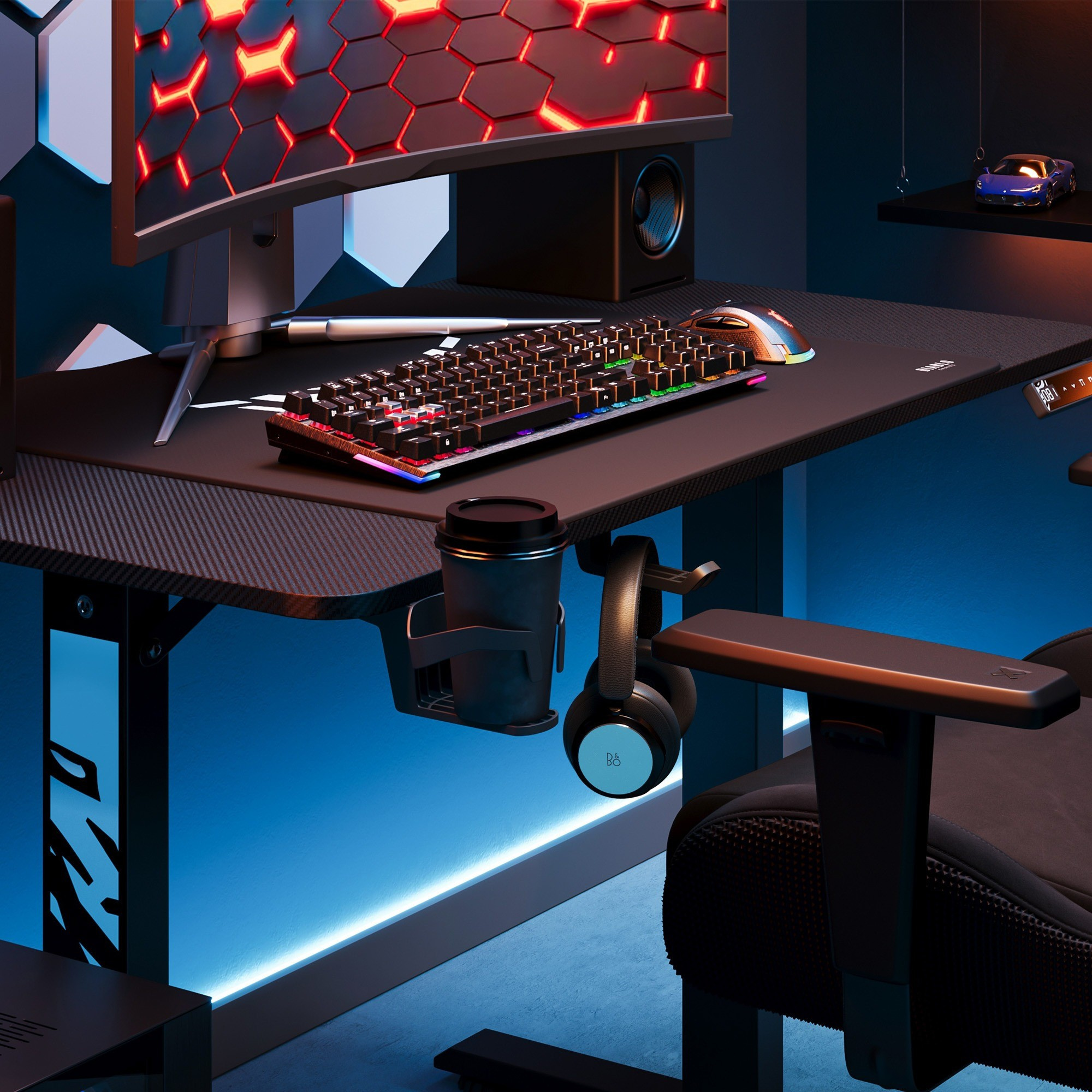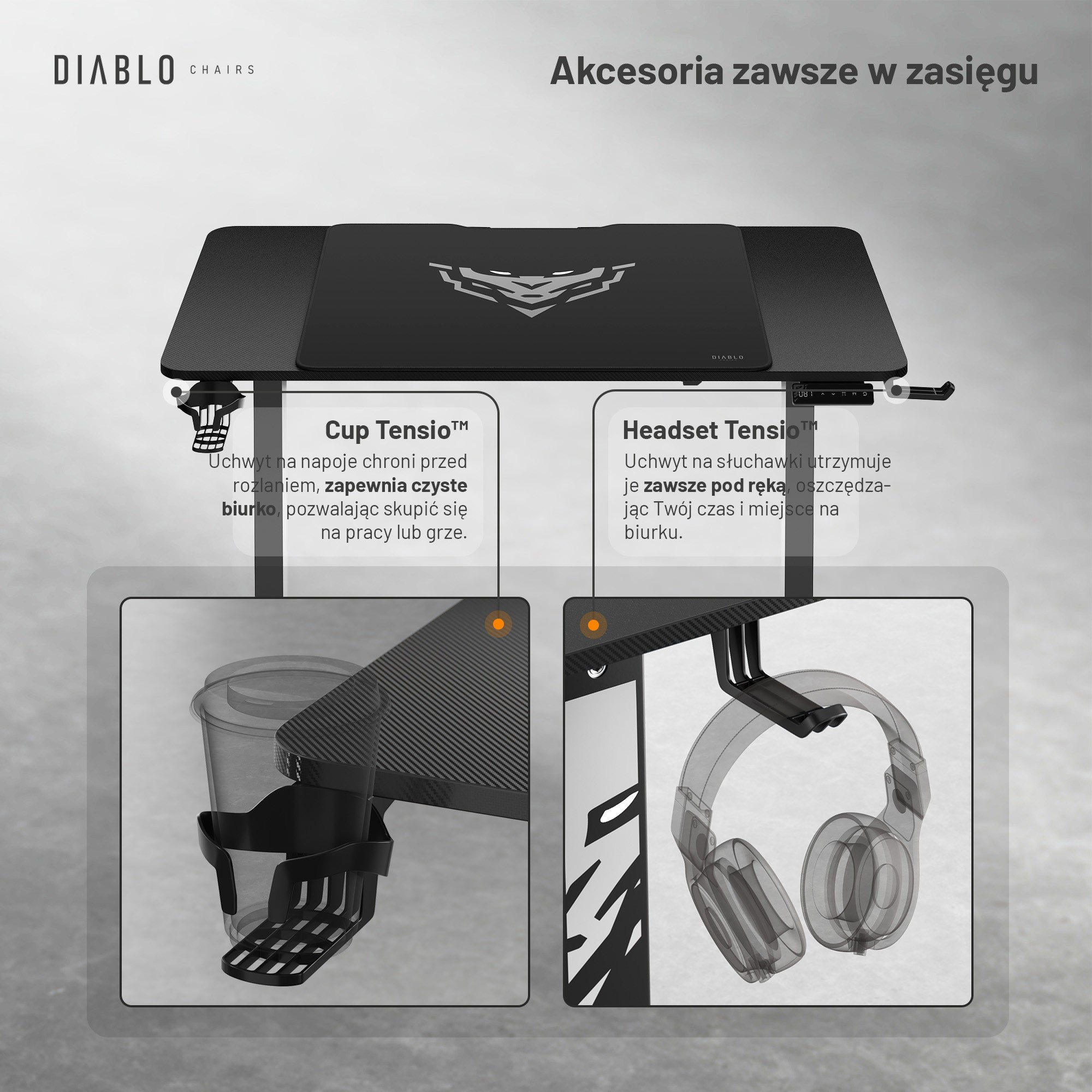 Preto je vybavený praktickými držiakmi na slúchadlá a hrnček. Vaše obľúbené príslušenstvo bude vždy po ruke, bez rizika rozliatia nápoja alebo poškodenia slúchadiel. Ušetrite cenné miesto na stole a užite si dokonalý poriadok.Organizácia káblov: Koniec zamotaným drôtom