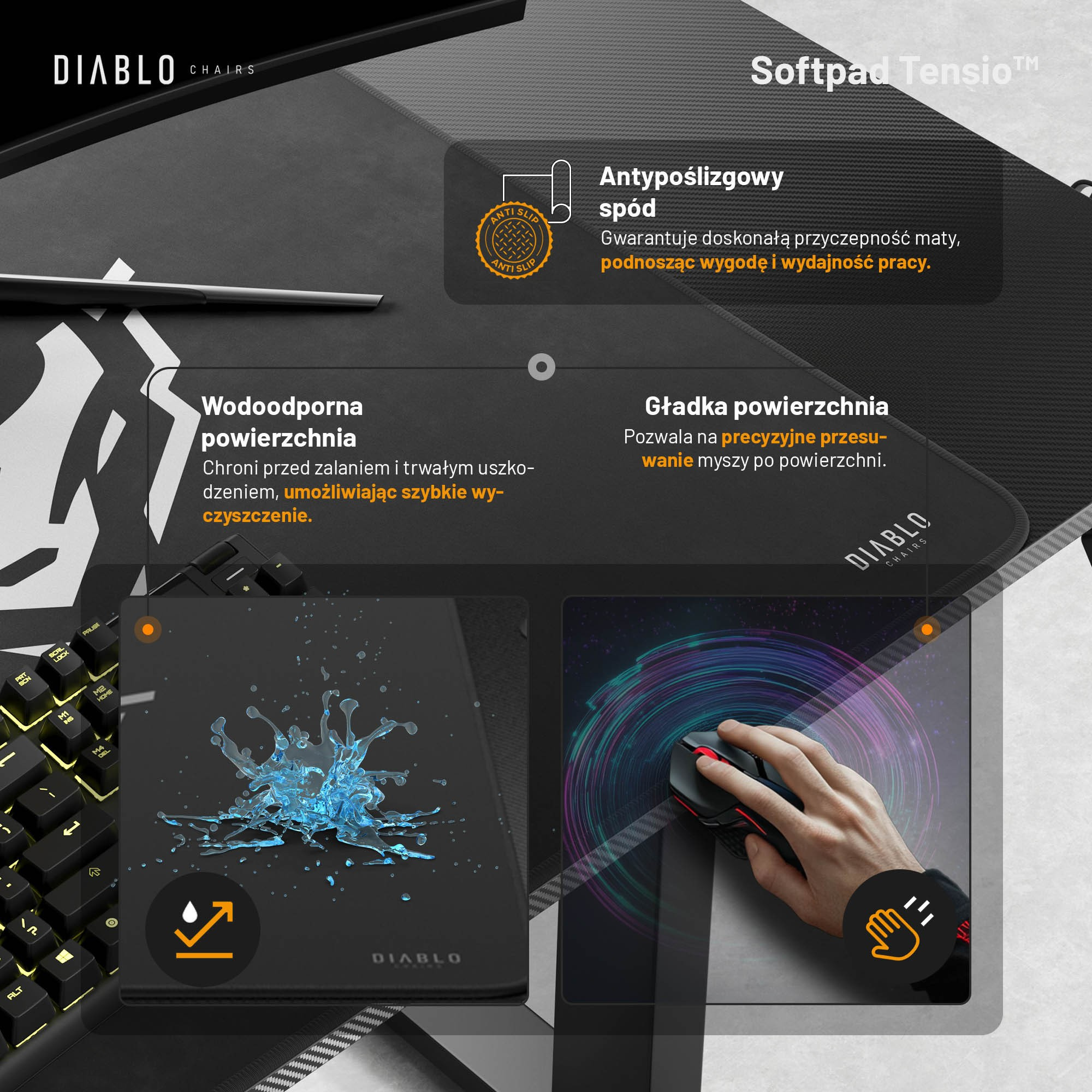 Hladký povrch podložky zabezpečuje plynulý pohyb myši a protišmyková spodná strana zaručuje dokonalú priľnavosť k doske stola. Vodoodolné vlastnosti podložky navyše uľahčujú údržbu a chránia stôl pred poškodením.Solídna a neochvejná konštrukcia: Stabilita, na ktorú sa môžete spoľahnúť