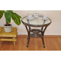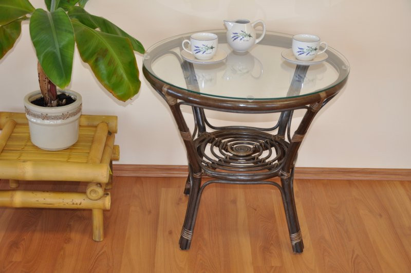 Stôl z prírodného ratanu so sklenenou doskou. Sklo je upevnené na plastových prísavkách zapustených do ratanovej konštrukcie stola a tým je pripevnené k stolu | Farba ratanovej konštrukcie je hnedá, výška stola je 55 cm, priemer sklenenej dosky je 60 cm