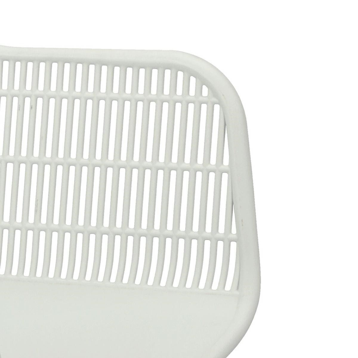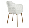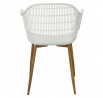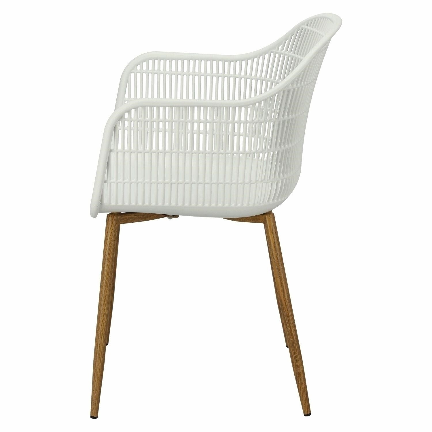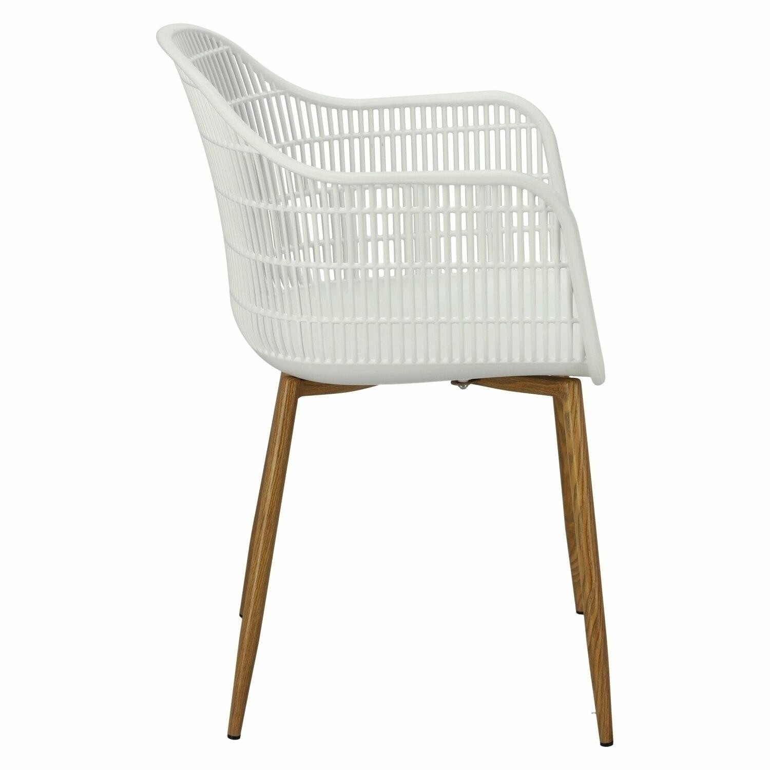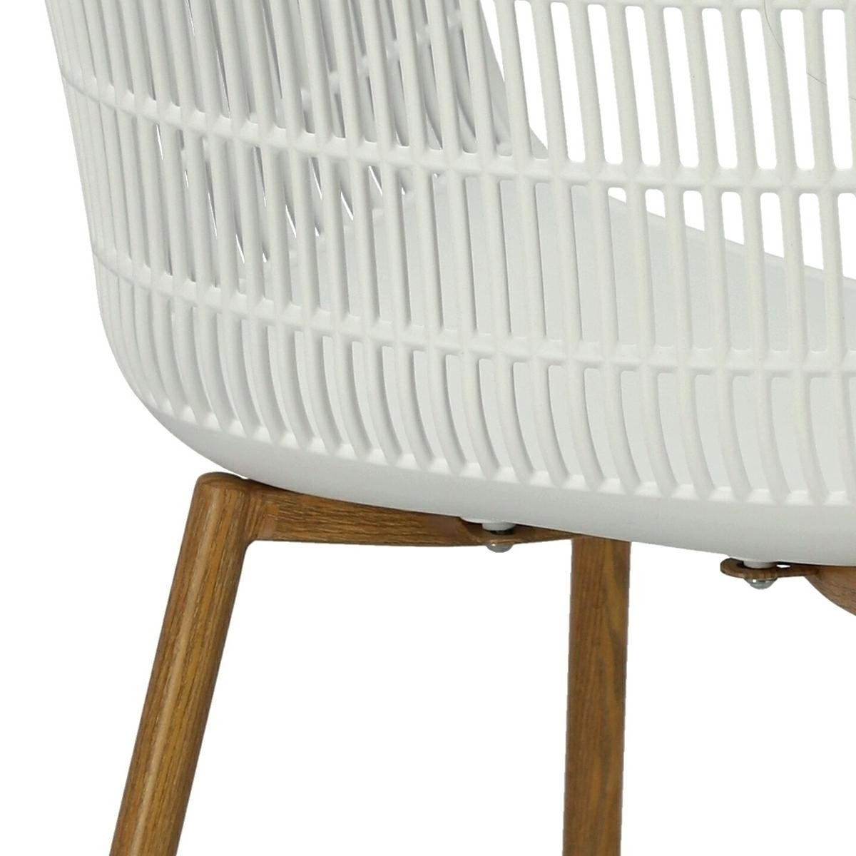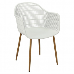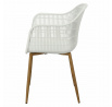 Moderná stolička Becker bola vyrobená z odolného materiálu v bielej farbe. Polypropylén použitý v sedadle má matnú úpravu, je ľahko čistiteľný a odolný voči znečisteniu, navyše sa vyznačuje aj odolnosťou. Charakteristické sedadlo, podrúčky a operadlo pripomínajú sieť. Základňa stoličky bola vyrobená z kovu pokrytého dyhou so štruktúrou dreva. Dyha použitá v základni má polomatnú úpravu. Maximálne zaťaženie stoličky je 120 kg. výška podrúčok od sedadla 27 cm hĺbka sedadla 45 cm šírka sedadla 48 cm Rozmery