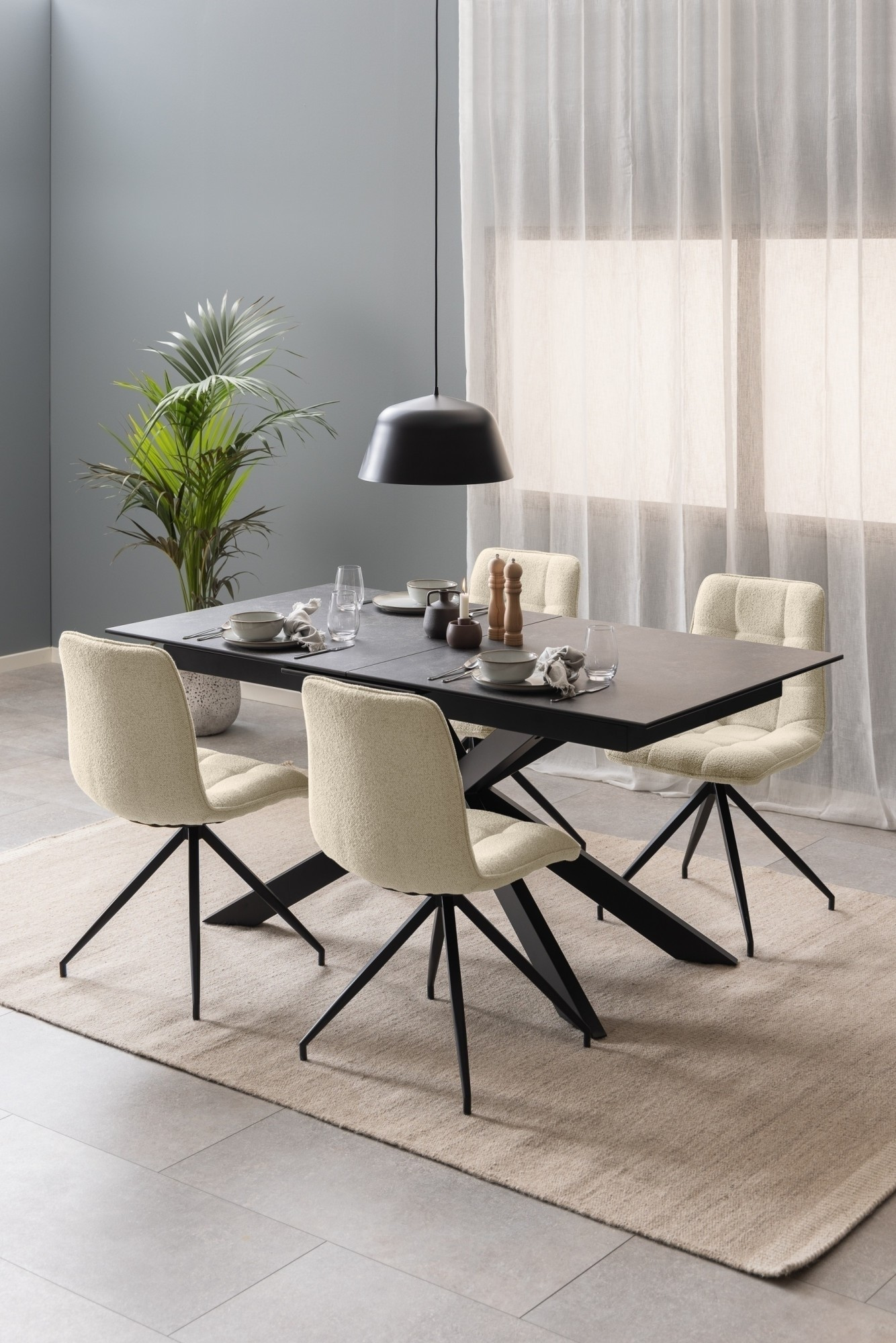 Stolička Capone je klasikou s nádychom modernosti. Navrhnuté v tvare obdĺžnika, sedadlo je potiahnuté mäkkým čalúnením v krémovej farbe. Ozdobná lemovka a štvorcové švy zdôrazňujú sedadlo a dodávajú mu štýlový vzhľad. Doplnením celku je čierna kovová otočná základňa. Hlavné vlastnosti: Jedálenská stolička s obdĺžnikovým sedákom Čalúnená krémovým poťahom bouclé s mäkkou, kučeravou štruktúrou Ozdobné lemovanie a štvorcové švy zabezpečujú útulný vzhľad Čierna, práškovou farbou lakovaná kovová základňa s otočnou funkciou Počet kartónov: 1 Rozmery kartónov: 64x55x60cm Hmotnosť kartónov: 6,5kg Šírka sedáka: 47cm Hĺbka sedáka: 40cm