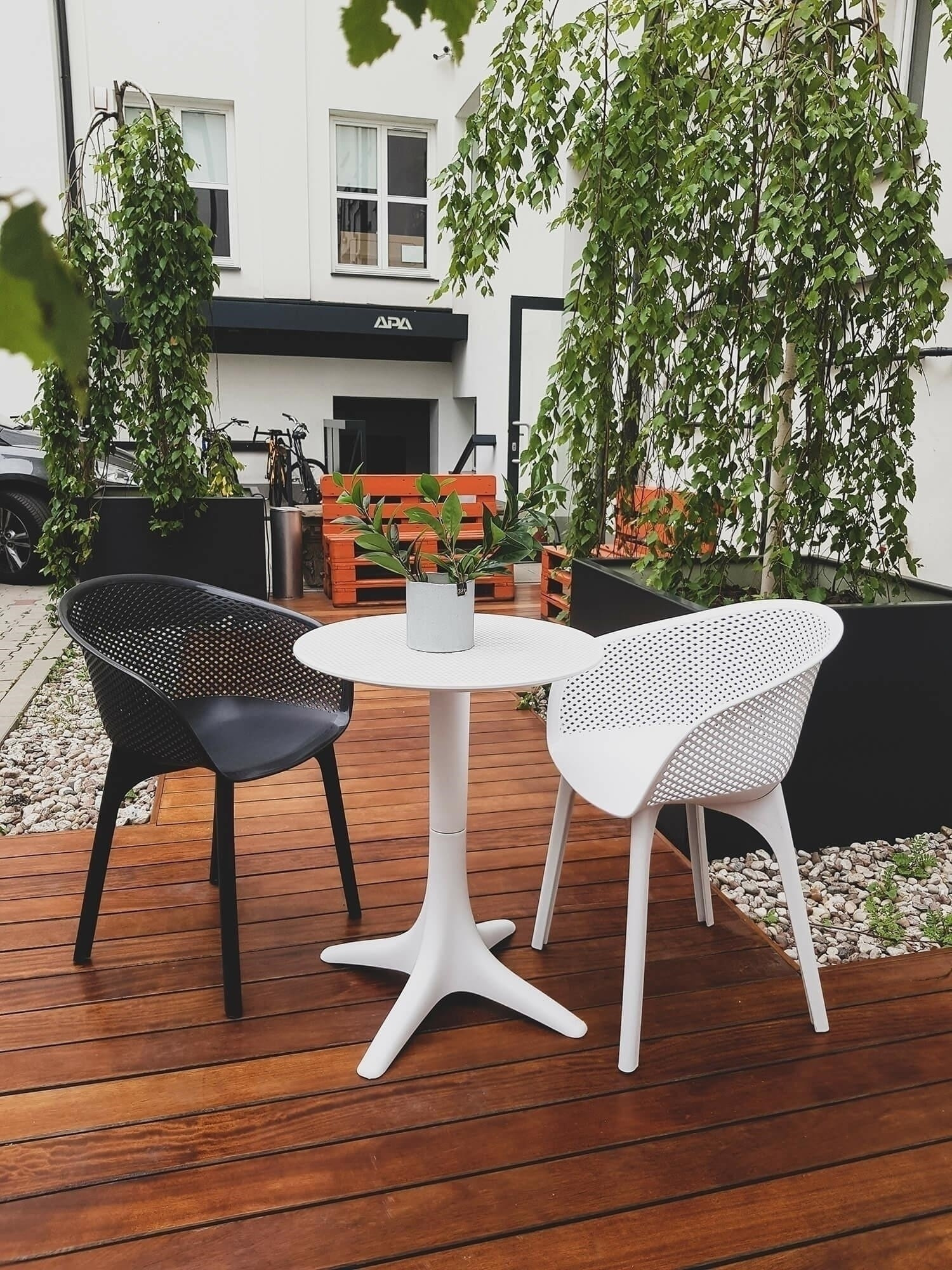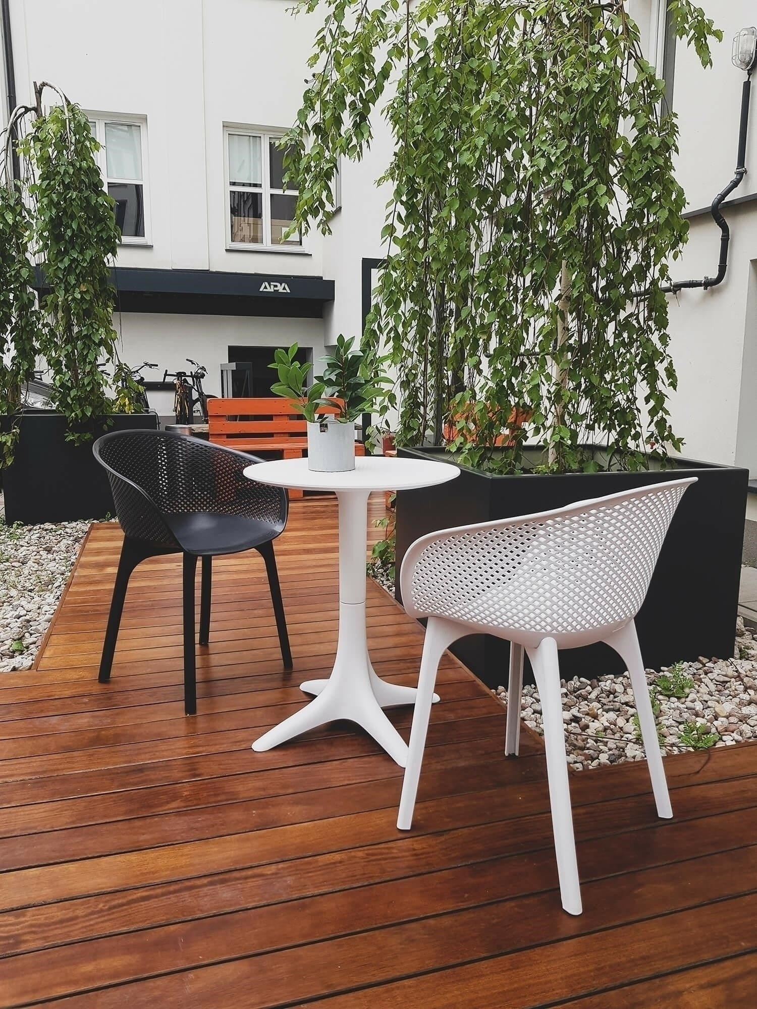 Stolička Dacun s prelamovaným profilovaným sedadlom je bestsellerová stolička, ktorá sa teší veľkému záujmu. Stolička Dacum svoju popularitu vďačí predovšetkým spôsobu jej prevedenia. Dopracované v každom detaile sedadlo s opierkami je nielen veľmi pohodlné, ale aj priedušné. Nohy stoličky sú tiež z materiálu, ktorý vďaka svojej textúre imituje drevo. Výroba stoličky z plastu zaručuje, že je odolná voči vlhkosti a škodcom, na rozdiel od drevených stoličiek. Stolička Dacum sa ideálne hodí k stolu Bloom. Takáto kombinácia nábytku je ideálnou súpravou na balkón, záhradu alebo do záhradky reštaurácie. Šírka sedadla: 38 cm Hĺbka sedadla: 37 cm Výška podrúčok: 74 cm Hrúbka nôh: 4 cm Rozmery balenia: 64x57x42 cm, hmotnosť 15 kg, Max. 4ks. v kartóne