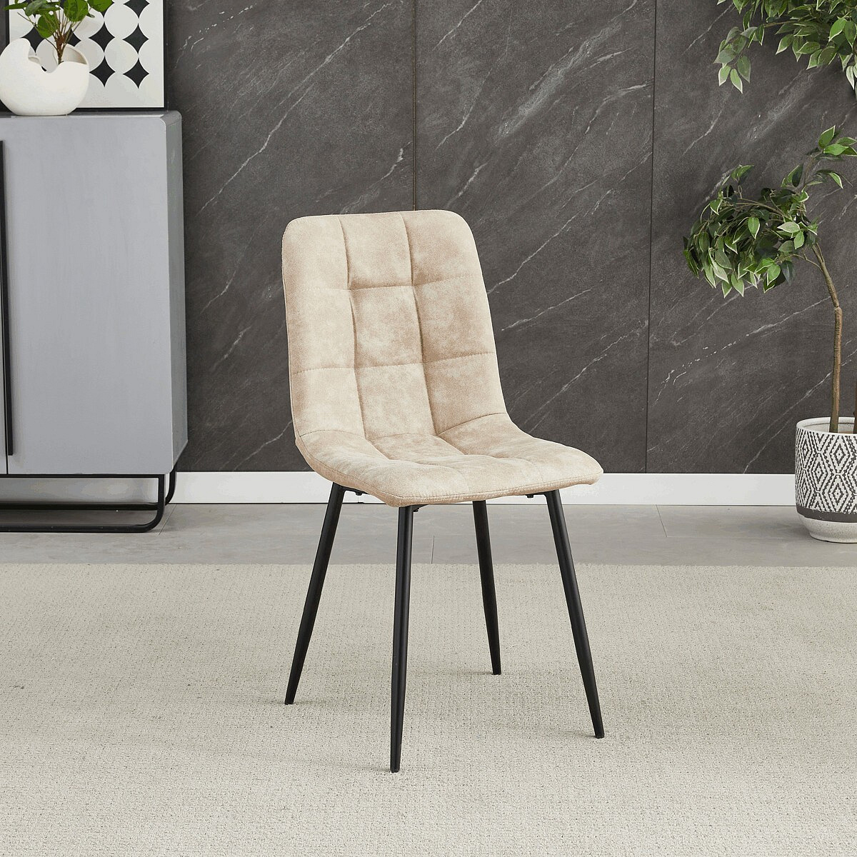 Jedálenská stolička značky Autronic v modernom industriálnom štýle je skvelou voľbou pre každú jedáleň. Poťah z látky vintage v krémovom odtieni dodáva nábytku osobitý charakter, zatiaľ čo elegantné štvorcové prešívanie podčiarkuje jej vzhľad. Čierne kovové nohy poskytujú stabilitu a ladia s minimalistickým dizajnom. Komfort pri sedení zabezpečuje mäkké polstrovanie z PU peny, vďaka ktorému je stolička ideálna ako na každodenné používanie, tak aj na slávnostné chvíle.