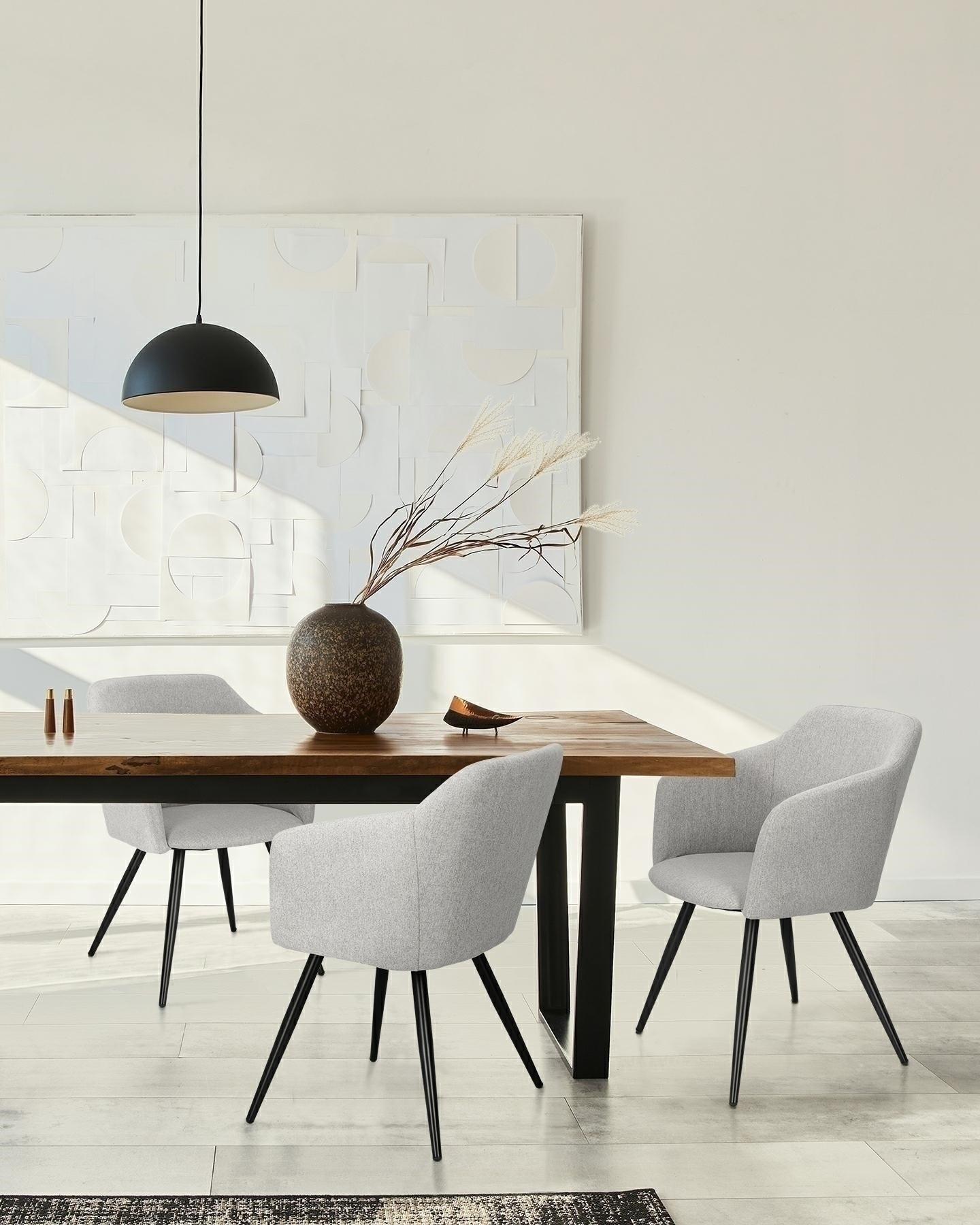 Elegantná stolička Molto je kombináciou módnej látky s odolnou kovovou základňou. Sedák v šedej farbe sa dokonale hodí k čiernej matnej základni. Kovové nohy sa ľahko čistia a sú odolné proti znečisteniu, zatiaľ čo sedák má matnú povrchovú úpravu. Produkt bol navrhnutý v štýle Glamour. Stolička je ľahká, váha sa pohybuje okolo 5-6 kg, jej maximálne zaťaženie je 120 kg. Rozmery: Výška sedadla: 46 cm Šírka sedadla: 42 cm Výška podrúčok: 70 cm Hĺbka sedadla: 46 cm Hrúbka nôh: 3,5 cm