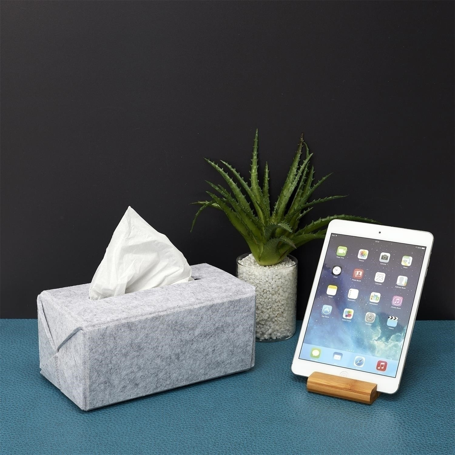 Plstená krabica na vreckovky sa osvedčí v modernom dome, kde výber farieb a vzorov nie je náhodný a nie nutne chceme vyžarovať farebnými krabicami na vreckovky. Jemný, plstený obal na vreckovky ich skryje, aby nehrali hlavnú úlohu v interiéri. Vďaka tomu vreckovky, aj keď sú po ruke, nenarušujú aranžmán interiéru. Filcový materiál