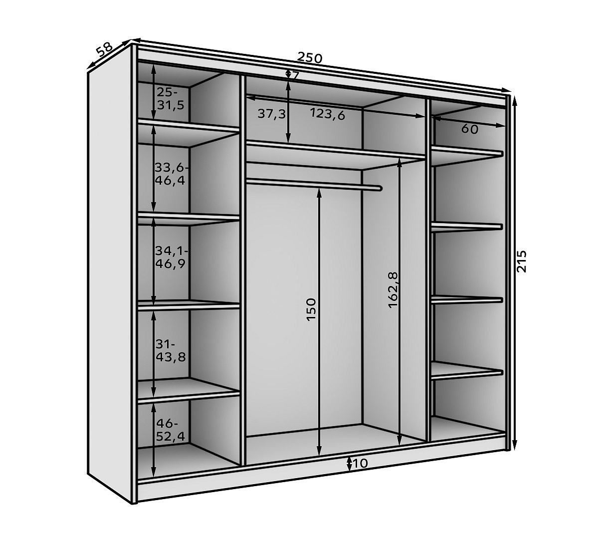 Šatní skriňa s posuvnými dverami 250 Andy je funkčné a elegantné riešenie pre každý interiér. Vyrobená z laminovanej dosky, zaručuje trvanlivosť a jednoduchú údržbu čistoty. Vďaka systému posuvných dverí skriňa šetrí miesto, ideálne sa hodí do menších miestností. Jednoduchý, moderný dizajn sa dokonale hodí k rôznym interiérovým aranžmánom. Bez zrkadla zostáva minimalistická a elegantná, ponúka priestranný priestor na uloženie oblečenia, posteľnej bielizne a ďalších predmetov. To je skvelá voľba pre tých, ktorí hľadajú funkčnosť a estetiku v jednom.