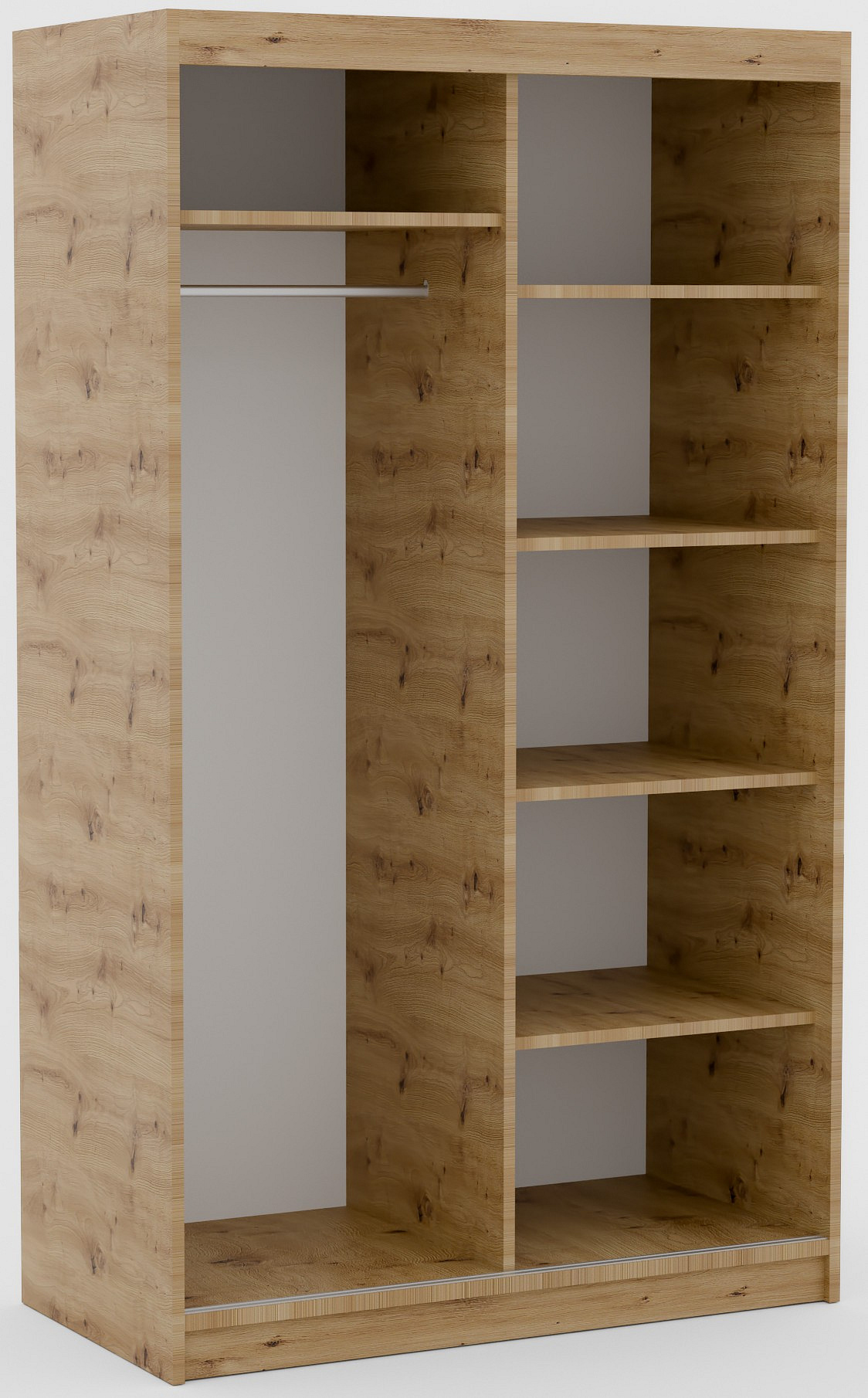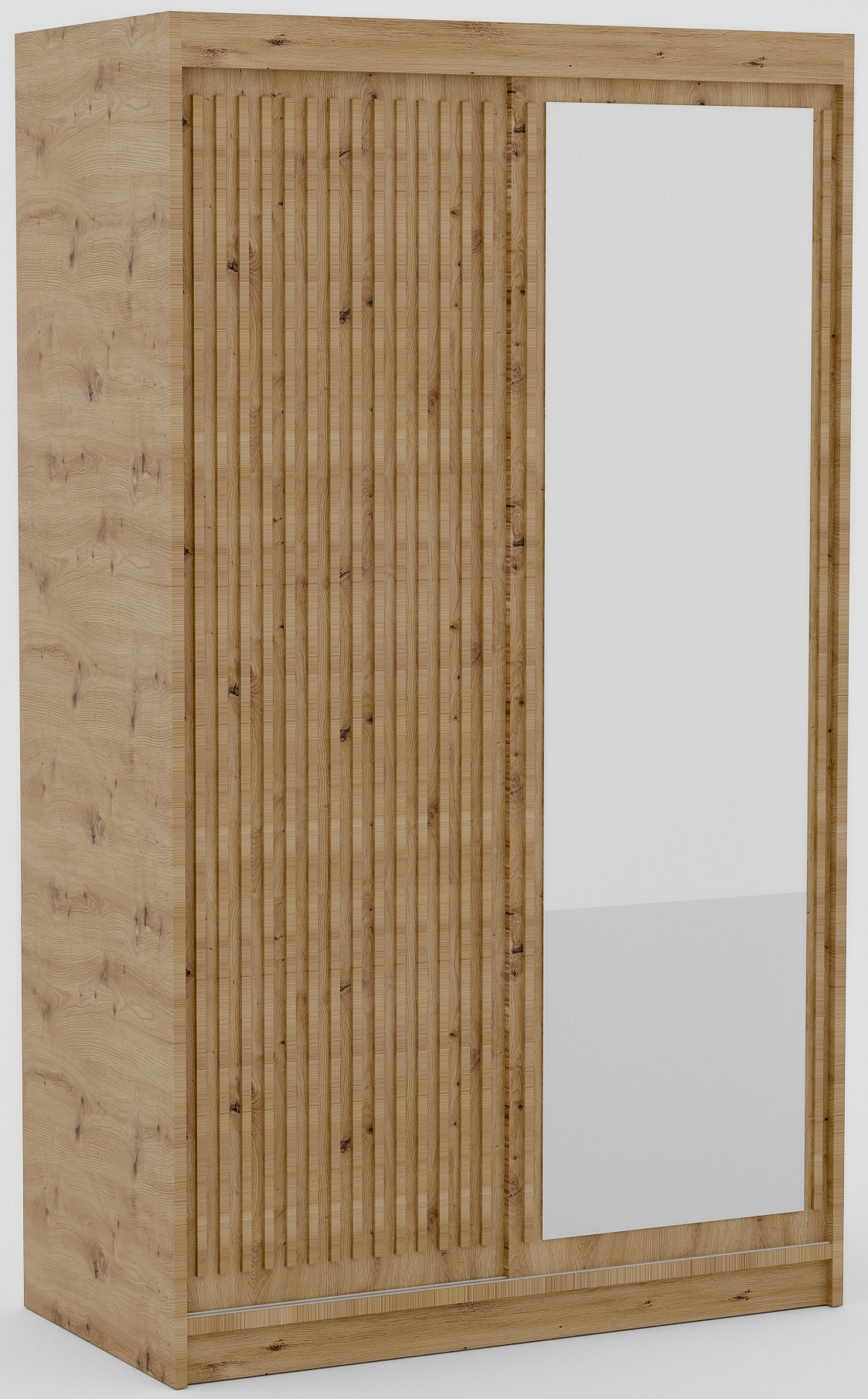 Šatní skriňa Delia s posuvnými dverami a lamelami v farbách dreva je štýlové a praktické riešenie pre ukladanie oblečenia a ďalších predmetov vo vašom dome. Jeho elegantný dizajn v drevených farbách dodáva interiéru teplo a útulnosť, zároveň sa hodí k mnohým rôznym usporiadaniam interiéru. Dvere skrine sú vyrobené z lamiel, čo jej dodáva ľahkosť a modernosť.
