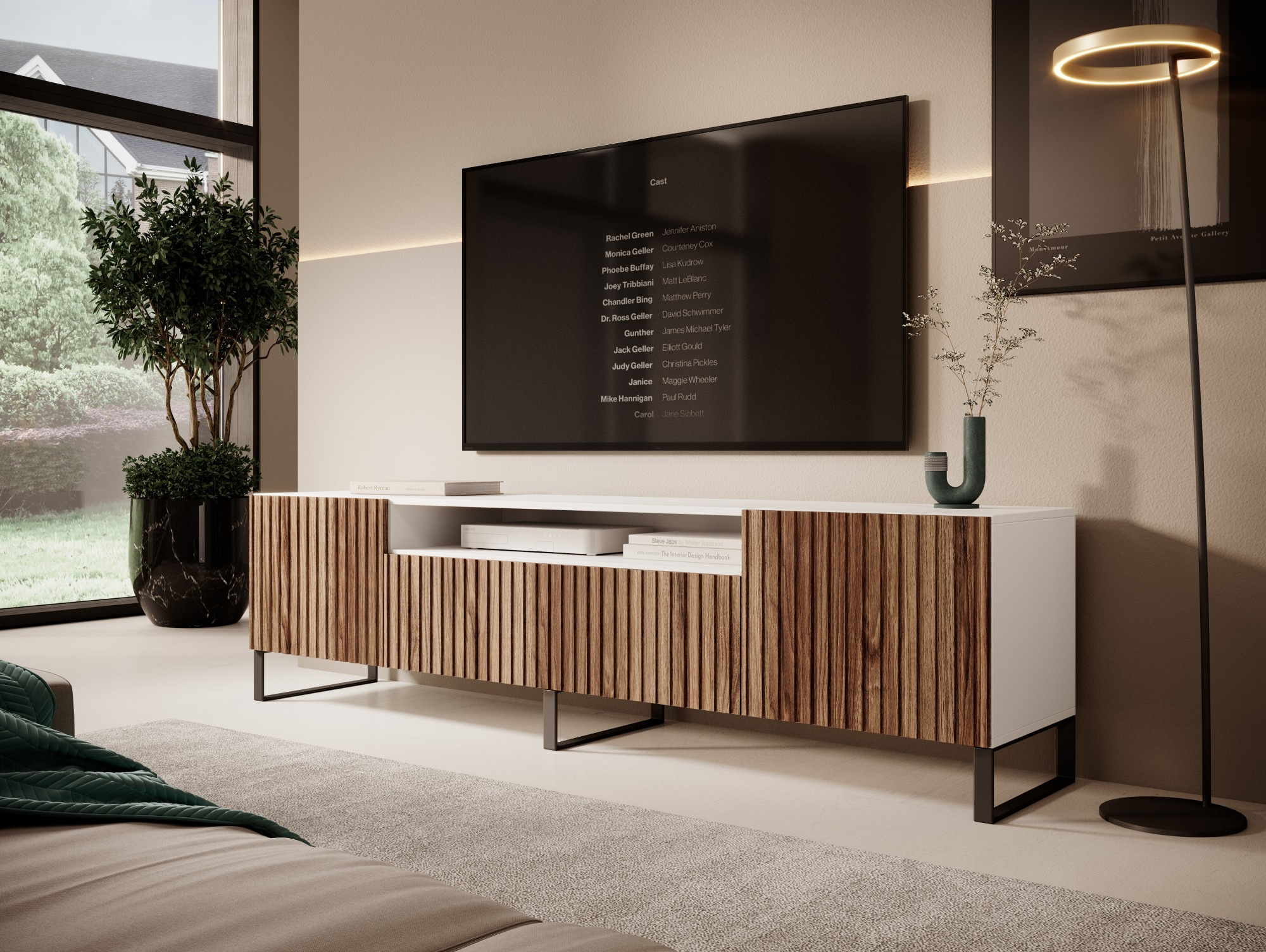 Skrinka RTV Miro – moderné riešenie pre vašu obývačku, ktoré spája eleganciu s funkčnosťou. Model je k dispozícii v dvoch farebných variantoch: klasickej bielej s dekorom katania a štýlovej čiernej s dekorom katania, dokonale ladí s rôznymi štýlmi interiérov.Televízna skrinka Miro je ponúkaná ako v stojacej, tak aj v závesnej verzii, čo umožňuje prispôsobenie vášmu priestoru a individuálnym preferenciám usporiadania. Vysoko kvalitné materiály, vrátane odolnej laminovanej dosky, zaručujú nielen trvanlivosť, ale aj elegantný vzhľad na dlhé roky. Skrinka má priestranné police a praktické výklenky, ktoré pojmú všetky zariadenia RTV a doplnky, zabezpečujú poriadok a ľahký prístup k potrebným zariadeniam.RTV Miro je ideálnou voľbou pre osoby, ktoré si cenia štýl a pohodlie.