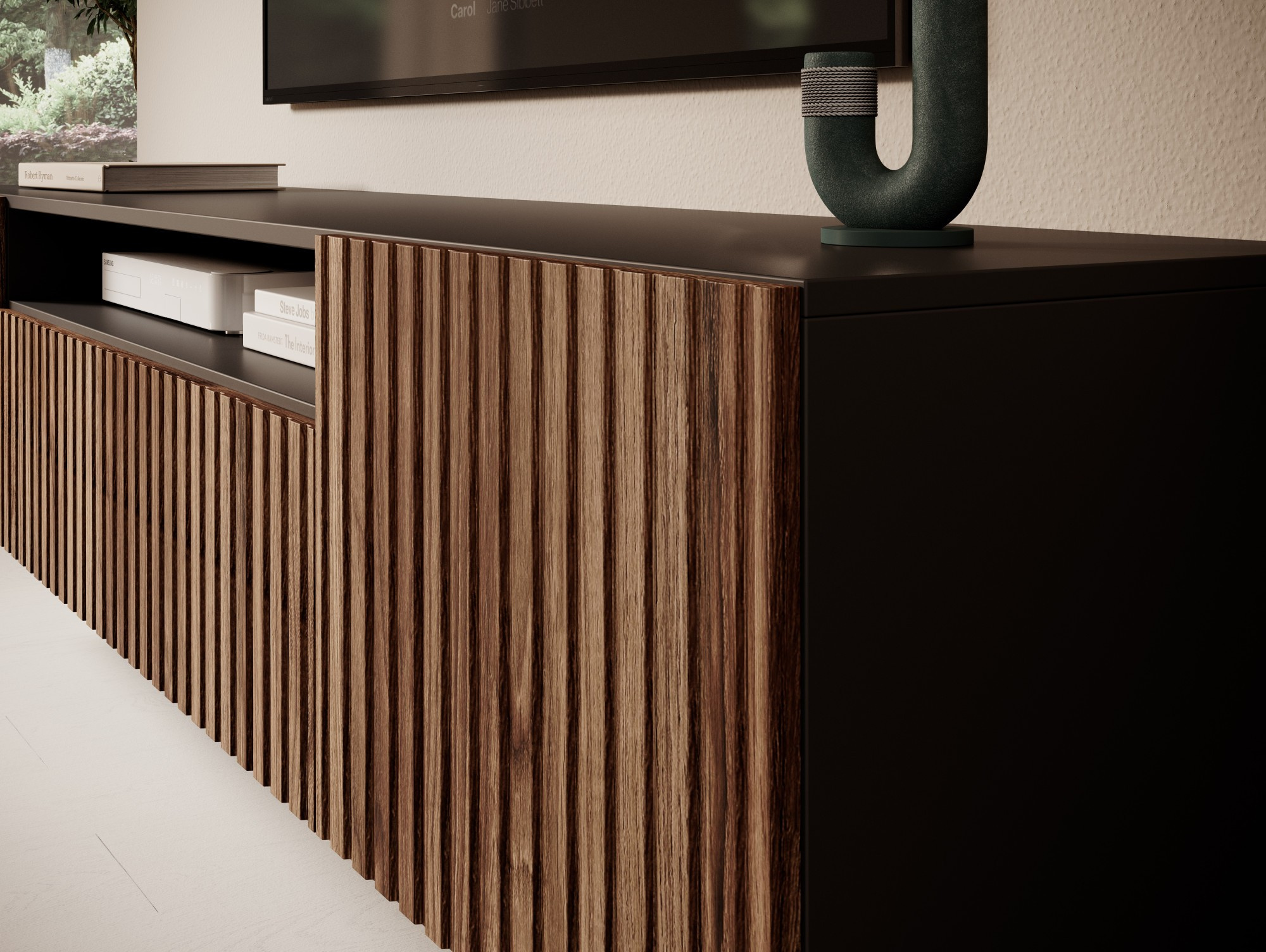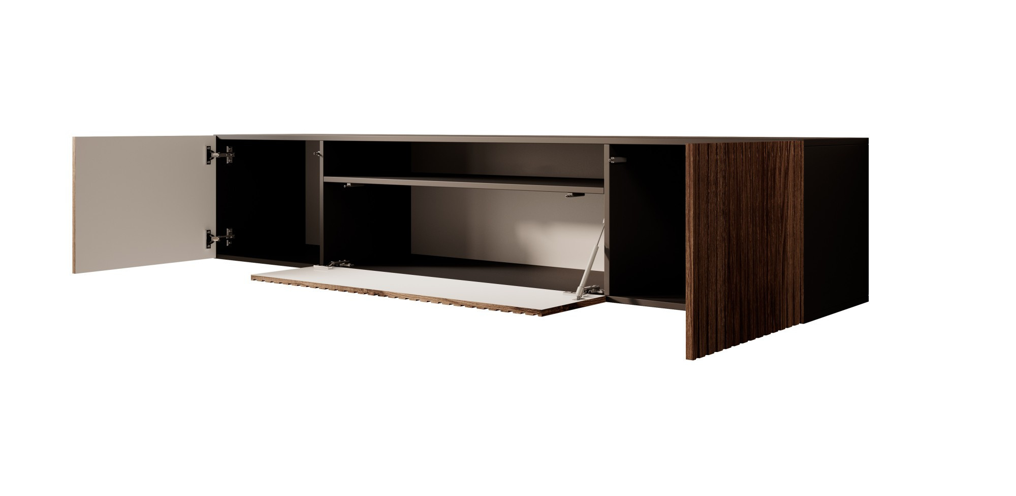 Skrinka RTV Miro – moderné riešenie pre vašu obývačku, ktoré spája eleganciu s funkčnosťou. Model je k dispozícii v dvoch farebných variantoch: klasickej bielej s dekorom katania a štýlovej čiernej s dekorom katania, dokonale ladí s rôznymi štýlmi interiérov.Televízna skrinka Miro je ponúkaná ako v stojacej, tak aj v závesnej verzii, čo umožňuje prispôsobenie vášmu priestoru a individuálnym preferenciám usporiadania. Vysoko kvalitné materiály, vrátane odolnej laminovanej dosky, zaručujú nielen trvanlivosť, ale aj elegantný vzhľad na dlhé roky. Skrinka má priestranné police a praktické výklenky, ktoré pojmú všetky zariadenia RTV a doplnky, zabezpečujú poriadok a ľahký prístup k potrebným zariadeniam.RTV Miro je ideálnou voľbou pre osoby, ktoré si cenia štýl a pohodlie.