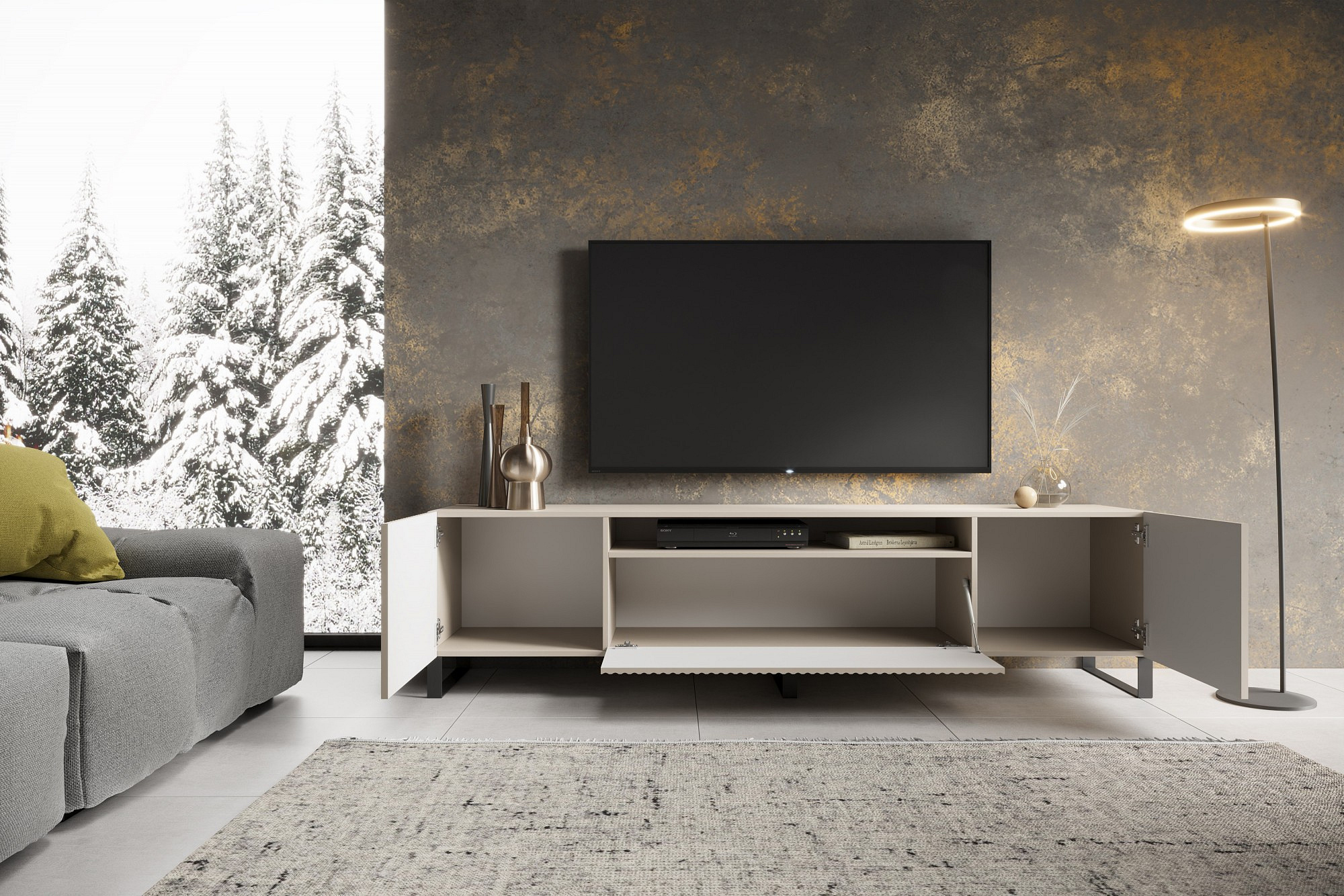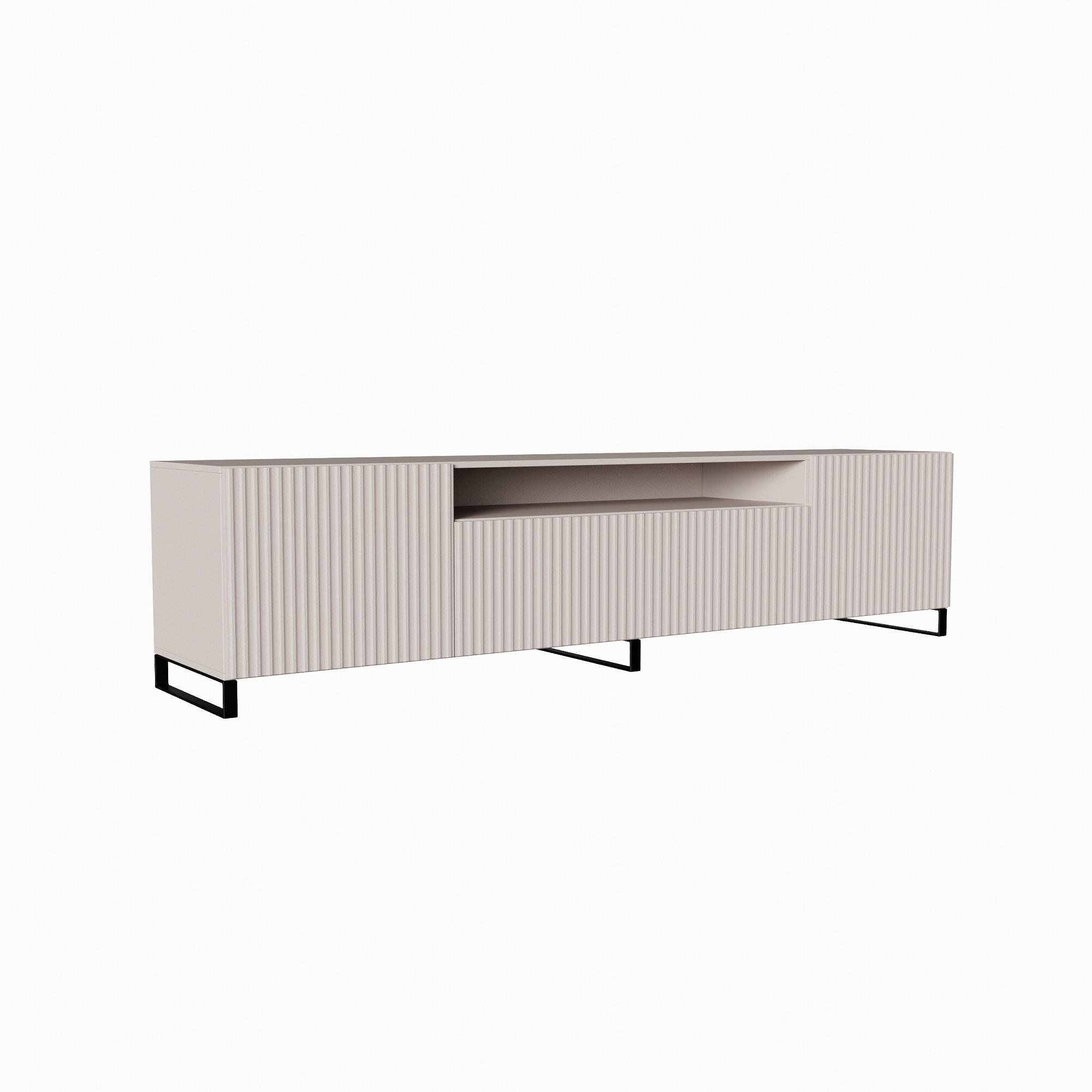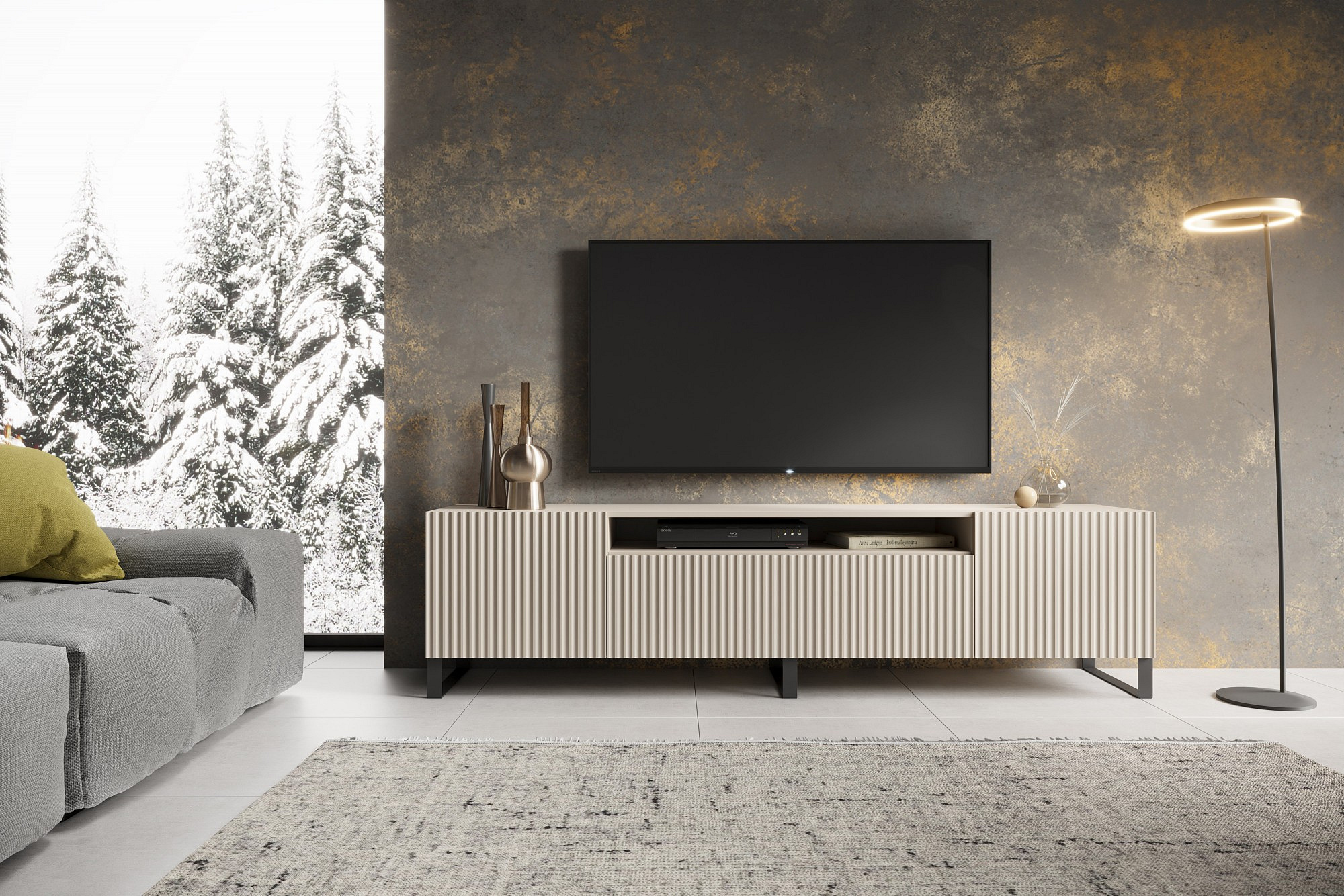 RTV Noemi to nowoczesna, elegancka i funkcjonalna szafka telewizyjna, idealna do wykorzystania w nowoczesnych wnętrzach. Jej unikalna cecha to ryflowane wykończenie, które dodaje charakteru i tekstury meblowi. Szafka została zaprojektowana w taki sposób, aby zawierała odpowiednie przegródki i półki, aby pomieścić różnorodny sprzęt elektroniczny, w tym telewizor, dekoder, konsolę do gier i wiele innych.