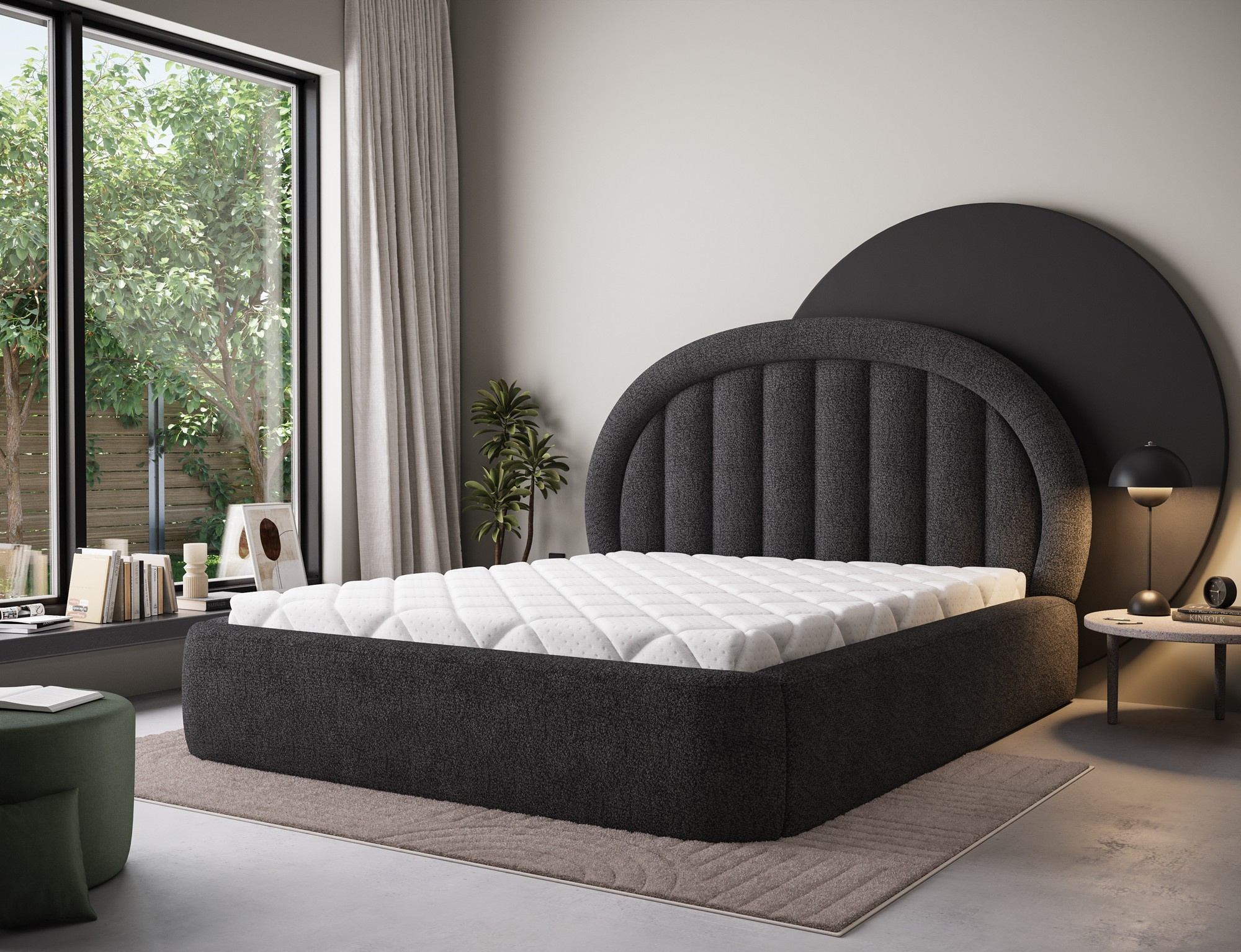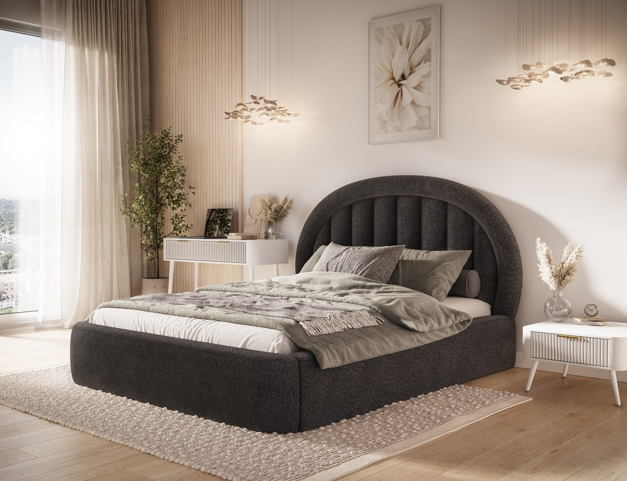 Posteľ do spálne Tapedo kombinuje moderný dizajn, funkčnosť a pohodlie pri spaní. Dostupné v troch veľkostných variantoch: 140x200 cm, 160x200 cm a 180x200 cm, umožňuje prispôsobiť šírku vašim individuálnym potrebám – 165 cm, 185 cm alebo 205 cm. Celková výška postele je 131 cm a hĺbka je 221 cm, čo konštrukcii dodáva elegantný a vyvážený vzhľad. Výplň z vysoko kvalitnej polyuretánovej peny T2130 zabezpečuje optimálnu podporu tela a vynikajúce pohodlie. Posteľ Tapedo je vybavená praktickým úložným priestorom na posteľnú bielizeň, ktorý uľahčuje udržiavanie poriadku vo vašej spálni. Stabilné čierne plastové nohy dodávajú dizajnu ľahkosť a moderný nádych. Vďaka svojej solídnej remeselnej práci, funkčným vlastnostiam a estetickej forme, posteľ Tapedo dokonale dopĺňa moderné interiérové usporiadanie, čím vytvára elegantný a útulný priestor pre odpočinok.