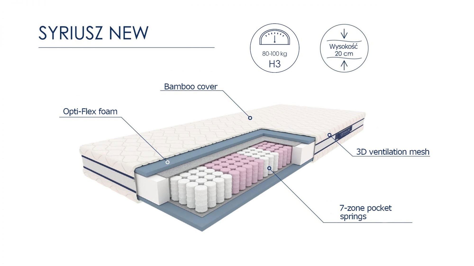 veľkosť: 140/200 cm, príspevok: 7-zónové vreckové pružiny, oddeľovače čalúnenia, penové panely Opti-Flex, poťah: bambusová tkanina, prešívaný ovsom 200 g/m2, 3D ventilačná sieťovina, úchyty a oddeľovacie zámky, teplota prania do 40 °C, výška: cca 20 cm, tvrdosť: stredná